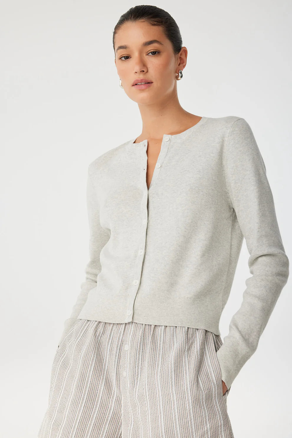 A slim-fitting cardigan in smooth organic cotton knit that layers effortlessly. The Flynn features a classic crew neckline and cropped silhouette with tonal buttons for easy styling. Lightweight and refined, ideal for transitional dressing.