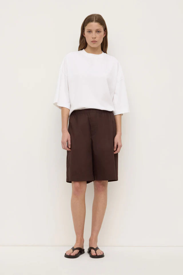 The Riley Poplin Short in ganache is a longline 100% cotton short with a relaxed A-line fit and an elasticated waistband with an internal tie.