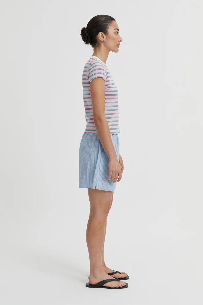 The Kendra Tee in Pink brings a playful edge to the classic baby tee. Crafted from a soft cotton blend in pink and blue stripes, it’s elevated by a sleek crew neckline and delicate chest embroidery. An easy staple to pair with denim, tailoring, or layered beneath oversized shirting.