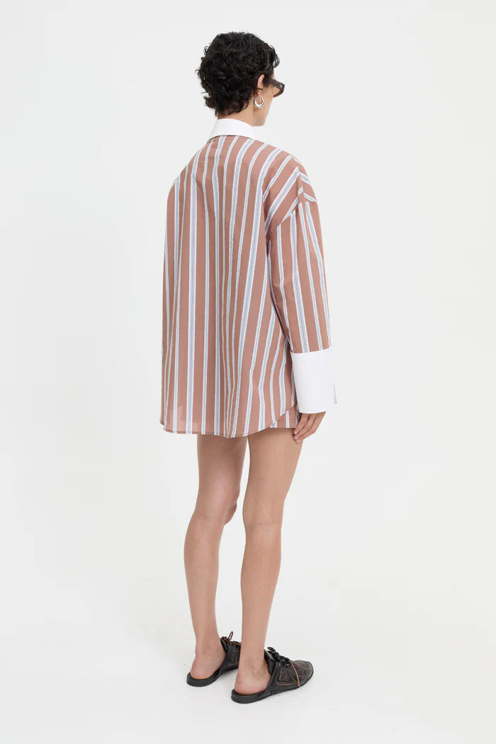 Cut in an oversized silhouette, the Opal Shirt in brown offers a modern twist on classic shirting. Made from lightweight cotton, it features warm brown and blue stripes with contrasting white cuffs and a structured collar. Wear it open over a tee or tucked into the matching Opal Shorts for a coordinated, stylish look.