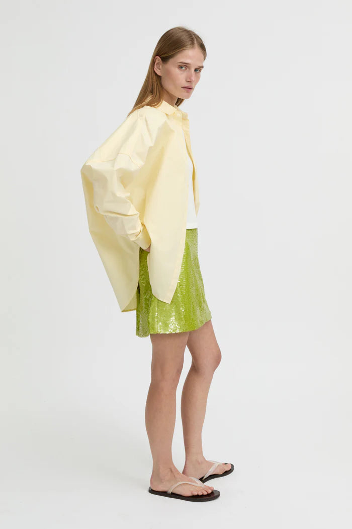The Yvaine Shirt in Butter brings a soft luminosity to your wardrobe. Crafted from pastel-yellow cotton, it’s cut to an oversized fit with a pointed collar, tonal buttons, and cuffed sleeves. Effortlessly versatile, it can be layered, worn loose, or tucked into tailoring—a refined essential with a fresh, sunlit mood.