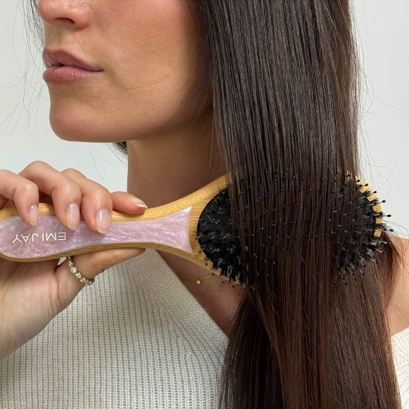 Meet our Flat Brush, where dual bristles work together to create a styling masterpiece. This brush is crafted with precision and features a harmonious blend of nylon bristles for effortless detangling, complemented by boar bristles that provide a glossy finish and help banish flyaways. It effortlessly adapts to the needs of any hair type, making it the ultimate everyday essential for those seeking a flawless and elevated hair care experience.