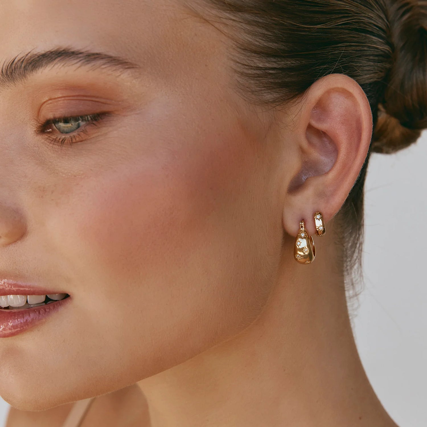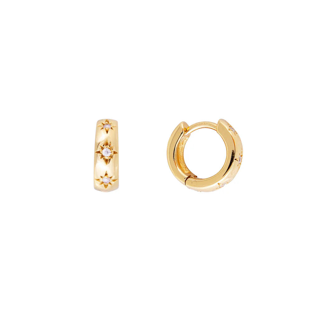 These glam 18k gold plate huggie hoops comprise 3 dangling stars. Add these to your ear candy collection ASAP!!