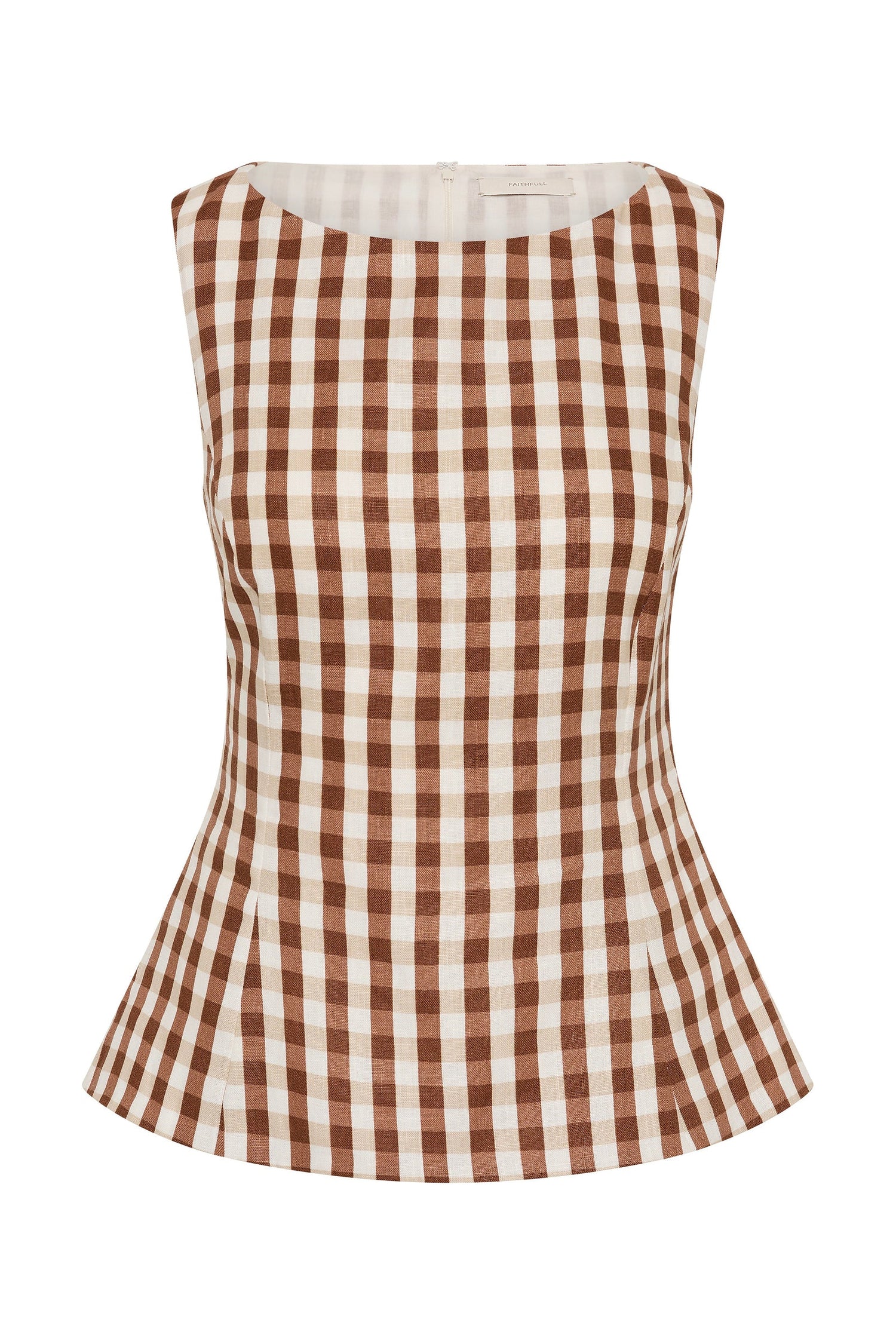 A 1960s-inspired sleeveless top, designed from a signature 100% European Flax® linen in a nostalgic gingham print. Fitted through the bodice with a boat-style neckline, it cinches in slightly at the waist before flaring out into a peplum hem that crops around the hips. Style with the matching Lila Mini Short for a vintage approach to everyday dressing.