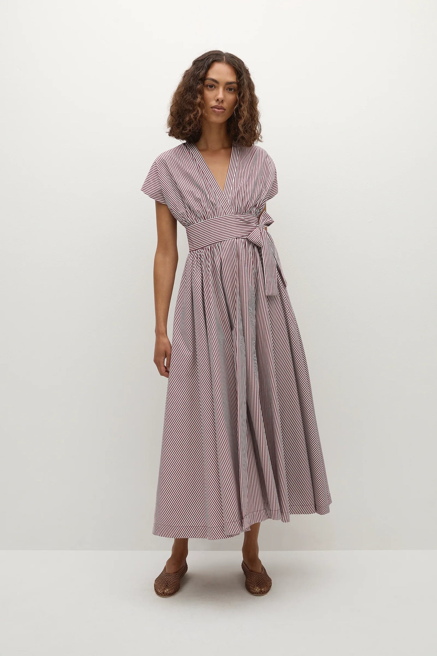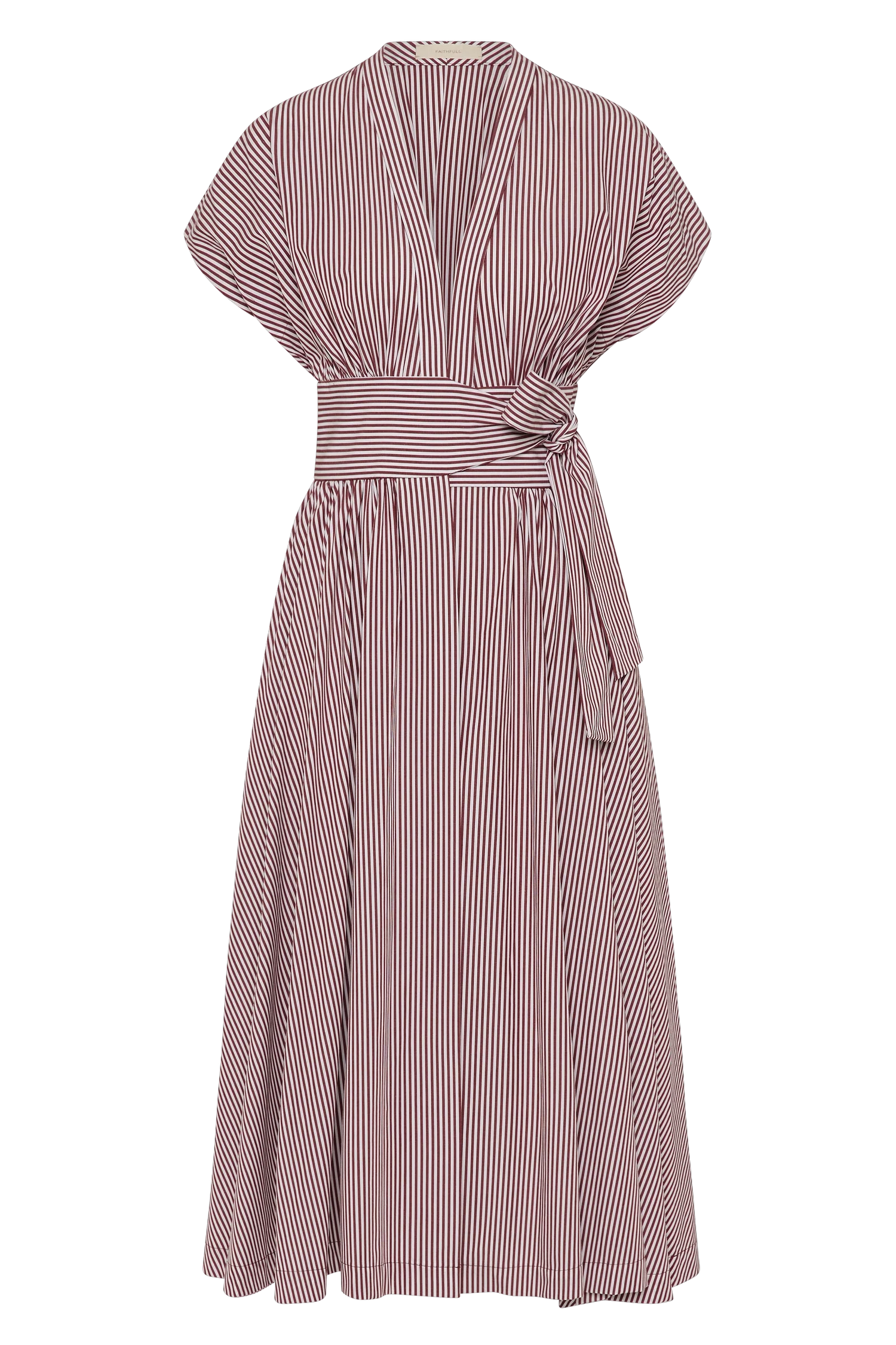 A wrap-style midi dress with a V-neckline and short cap sleeves. Intended to hang effortlessly on the body, it closes in at the waist with a wide belt and tie, before falling into a relaxed A-line skirt with slight gathering. Designed from a 100% BCI Certified cotton in a Scandinavian-inspired burgundy white stripe, style with a ballet flat for weekend to wear versatility.