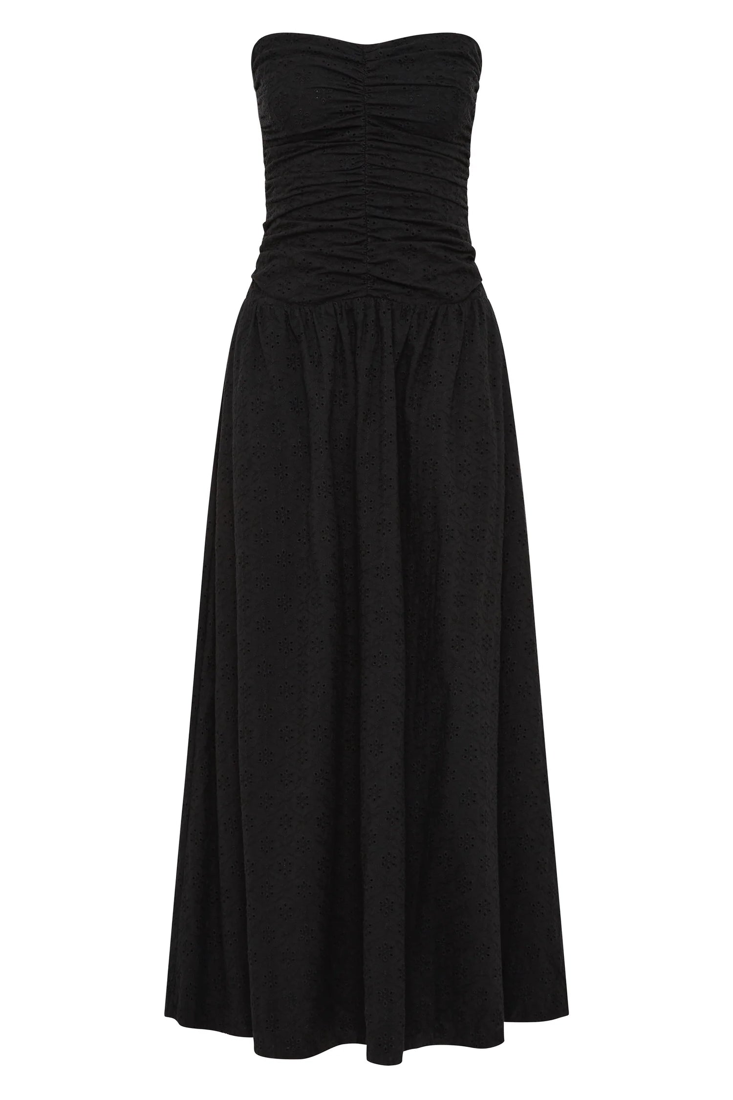 A feminine maxi dress, designed from a uniquely delicate anglaise broderie fabrication in a classic black. Strapless with a fitted bodice, there is ruched detailing through the front for a vintage touch and a gathered waist. From there it falls into a soft A-line skirt, cropping around the ankles. Style with a kitten heel for the perfect summer LBD.
