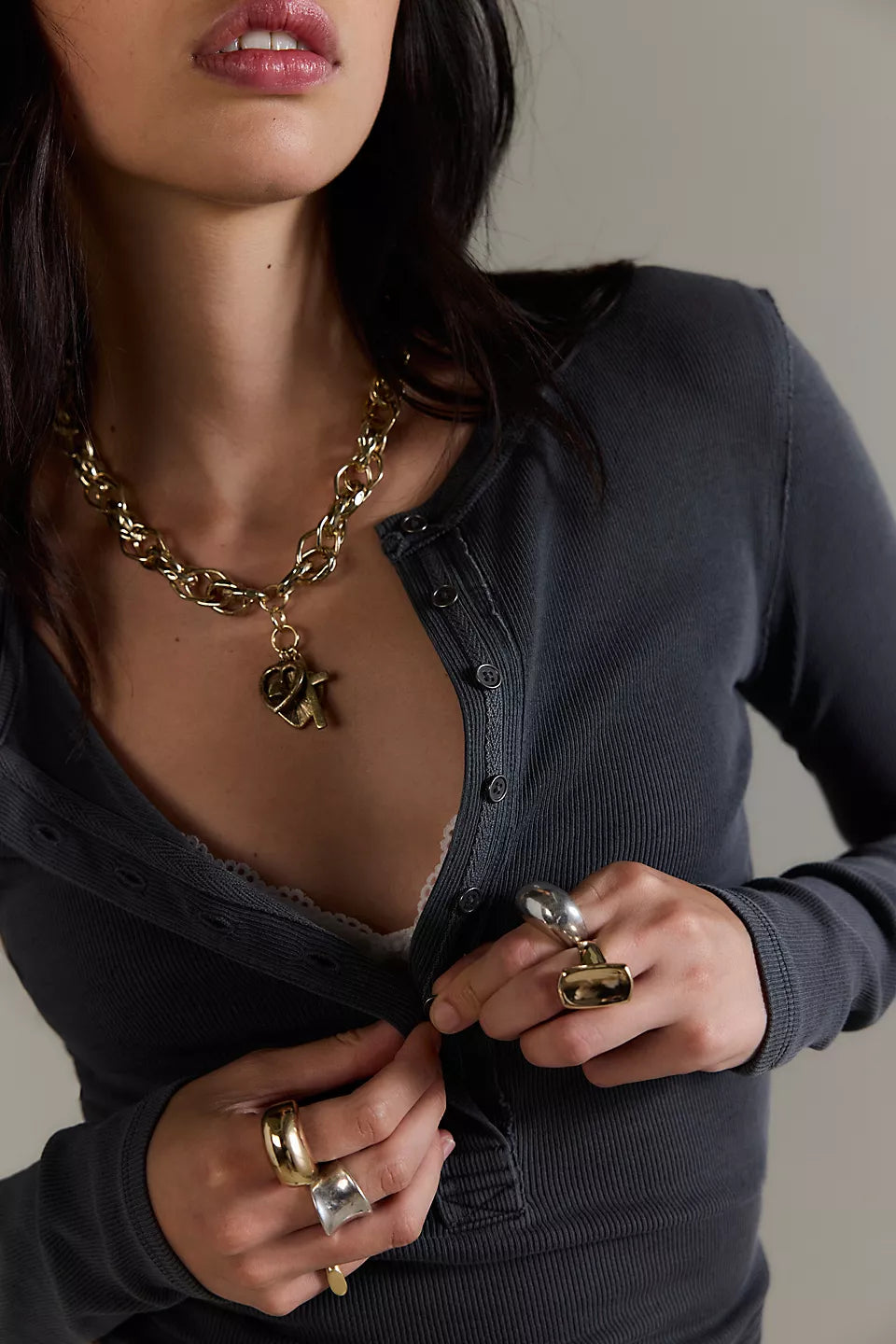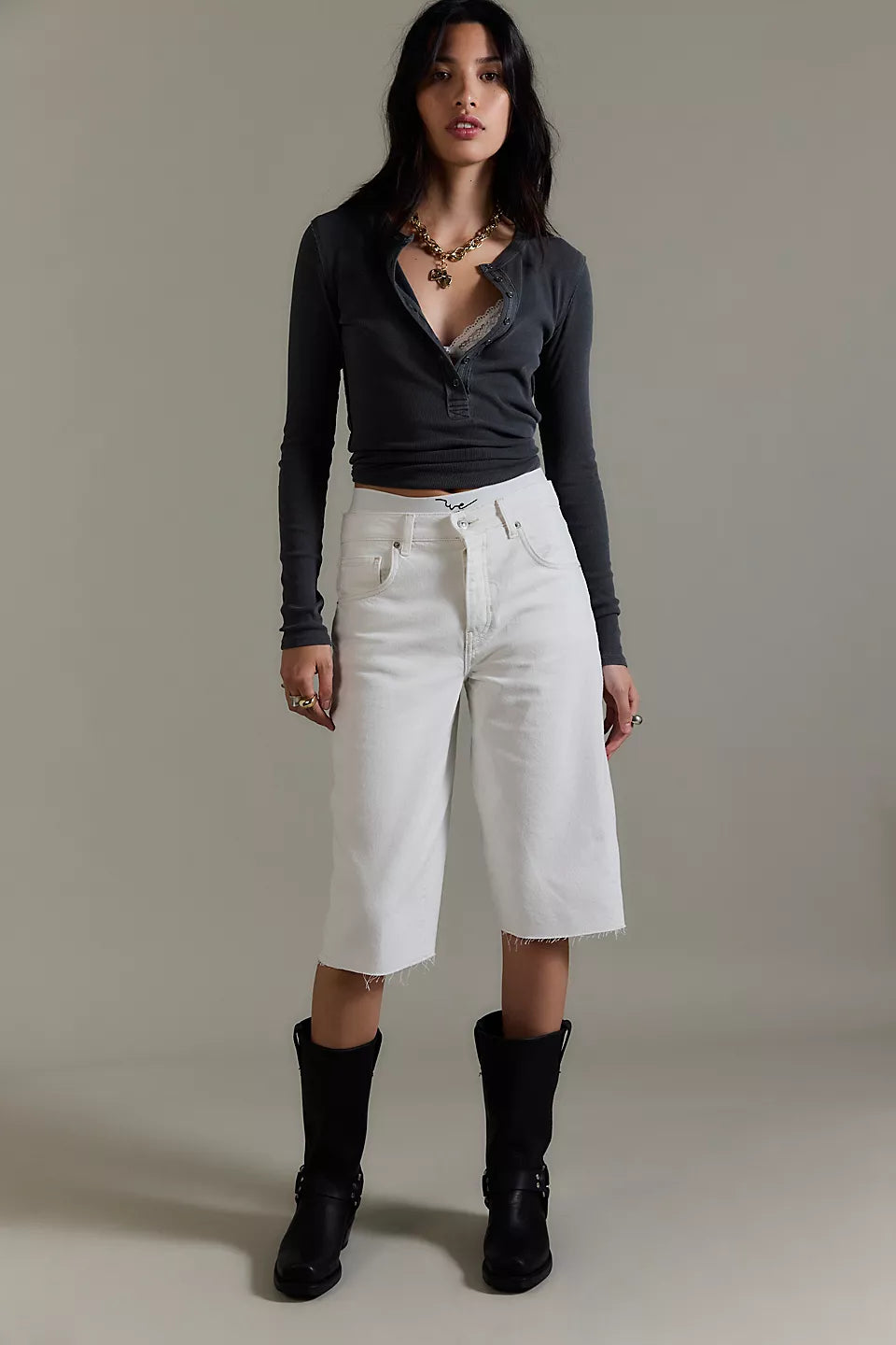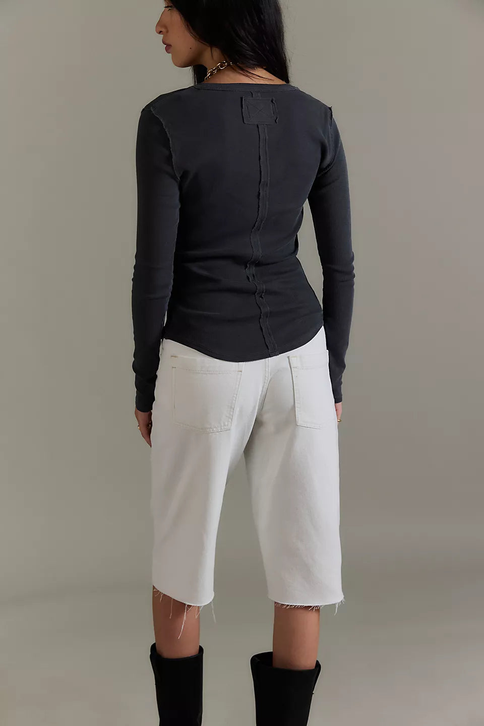 Features: Soft cotton fabrication with a stretchy feel, henley-style with button closures, fitted long-sleeves, exposed seam detailing, round hemline