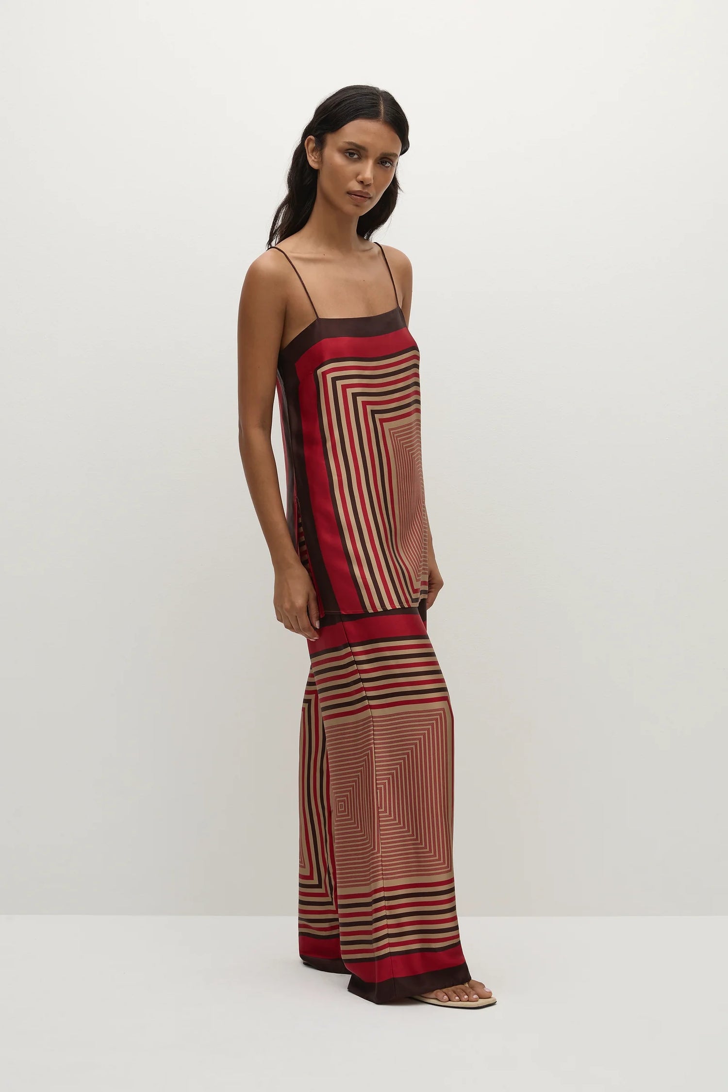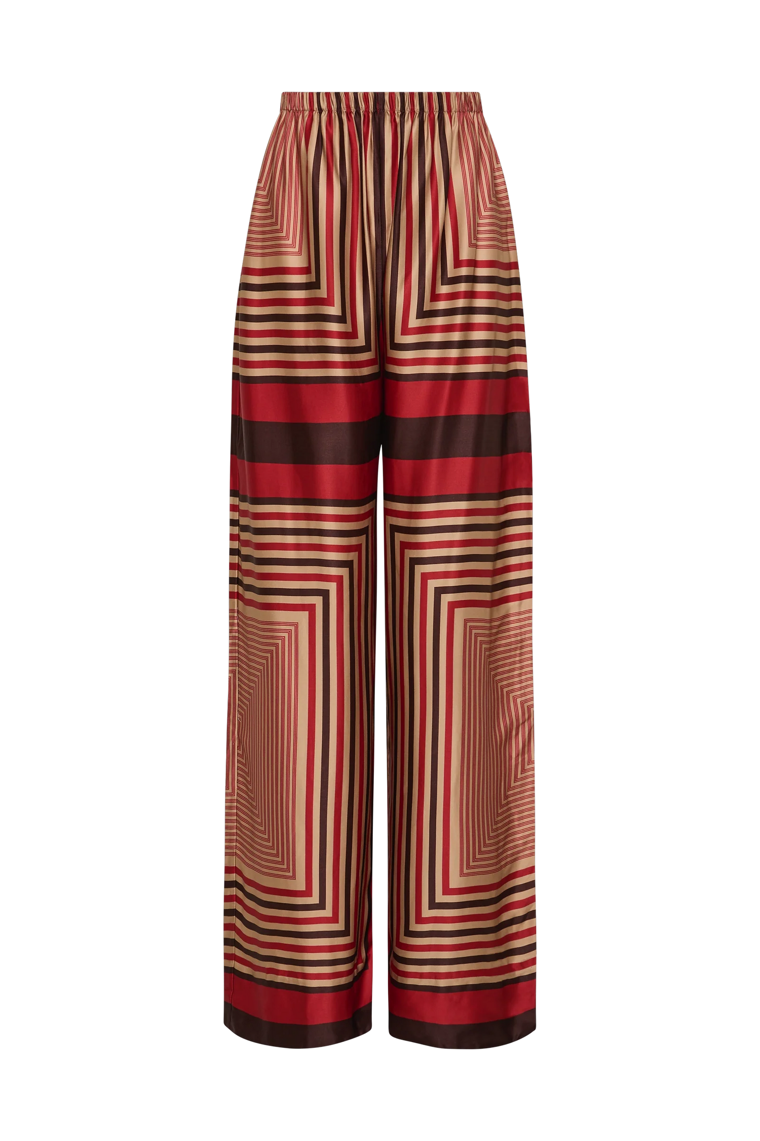 A relaxed yet elevated pant designed from a luxurious blend of rayon and viscose in a geometric red brown stripe. Featuring an elasticated waist for a comfortable fit, they fall into a straight leg, long in length. Style under the matching Aina Top or Cora Shirt.