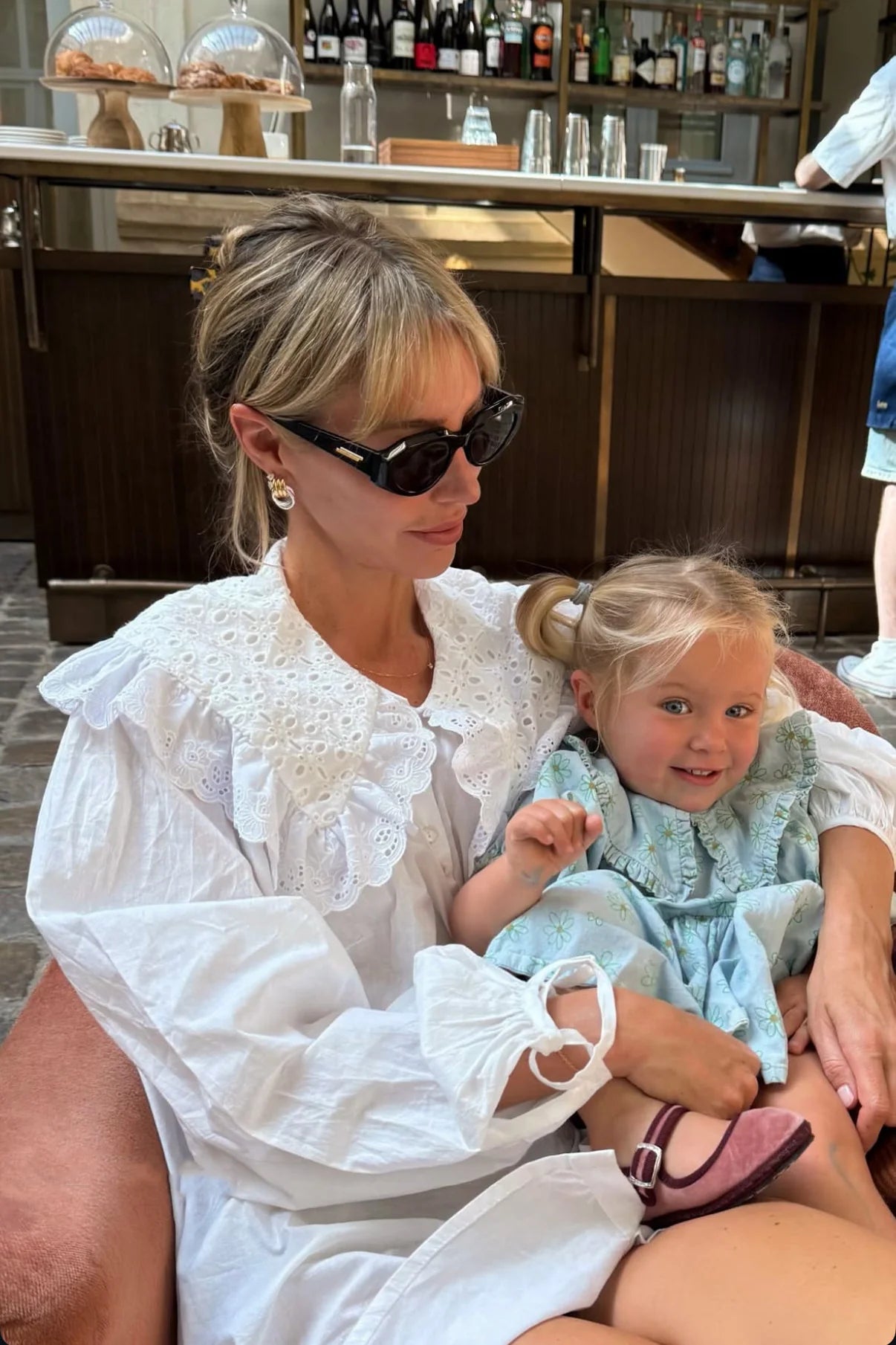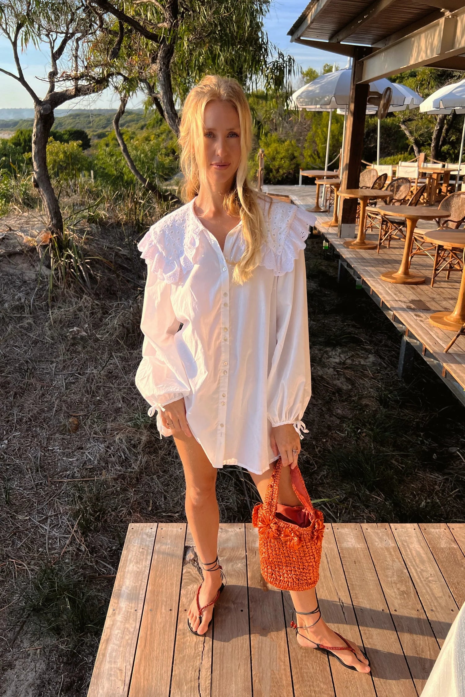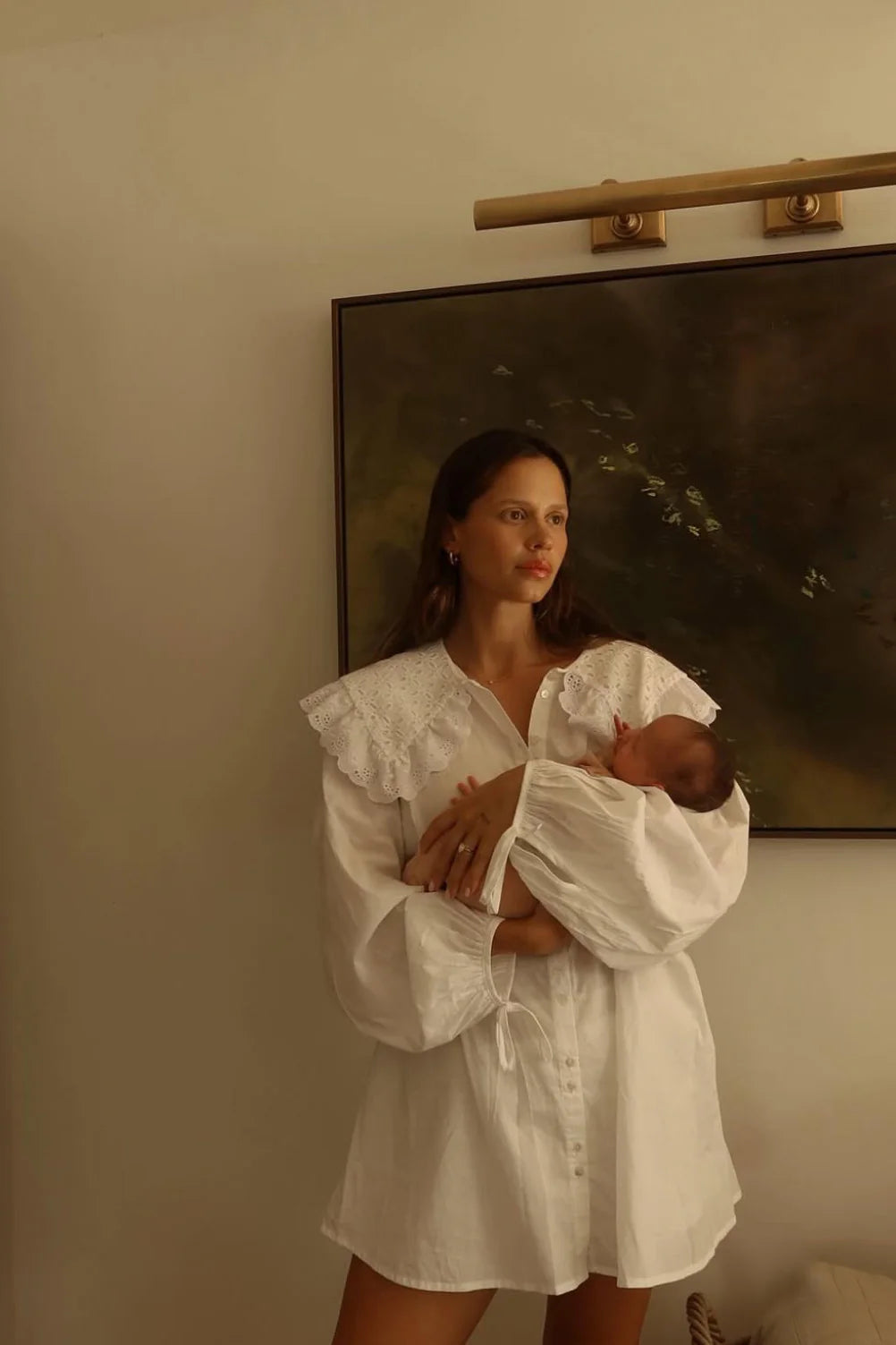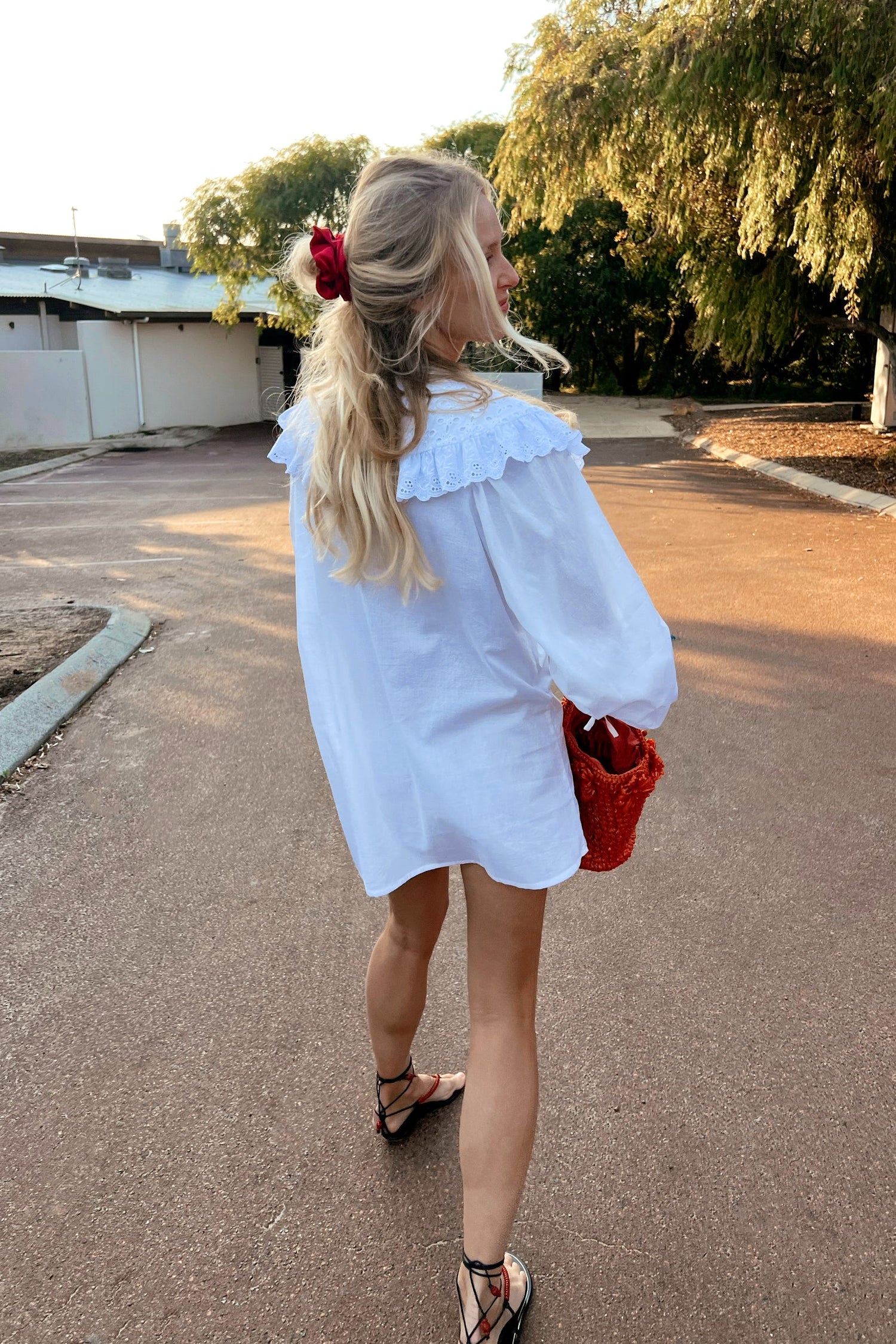 A chic, button-up mini dress with a feature peter pan embroidered collar, antique style silhouette and flattering, billowing sleeves adorned with a tie-up cuff. Model wears a size SM.