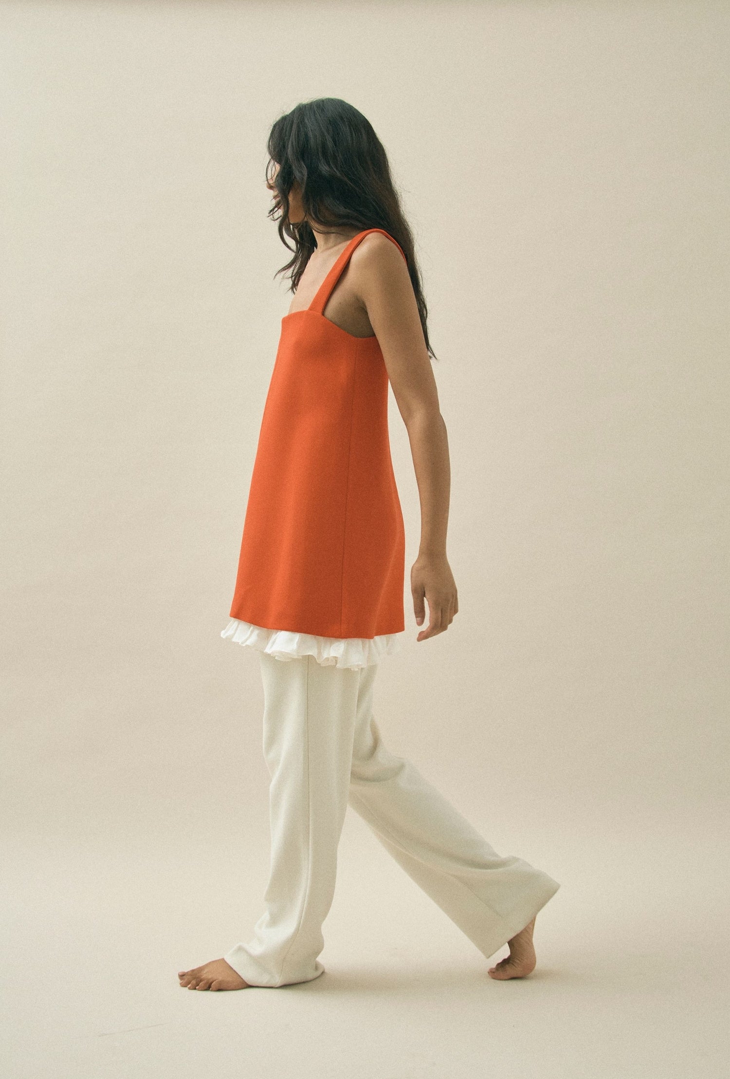 A polished yet contemporary red shift dress with a flattering square neckline, contrasted by a soft frill hem in navy silk. Model is 178cm wearing a size 8/S.