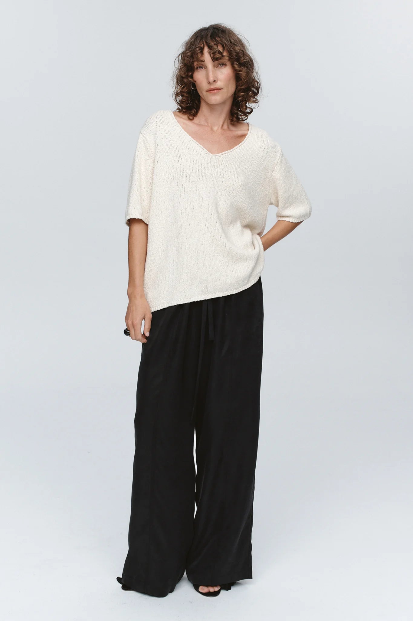 The Nya Tee offers an elevated take on everyday knitwear, crafted in a tactile, lightweight 100% Cotton. Its relaxed t-shirt shape features a wide V-neckline, short sleeves and softly ribbed edges, lending an effortless drape and understated texture.