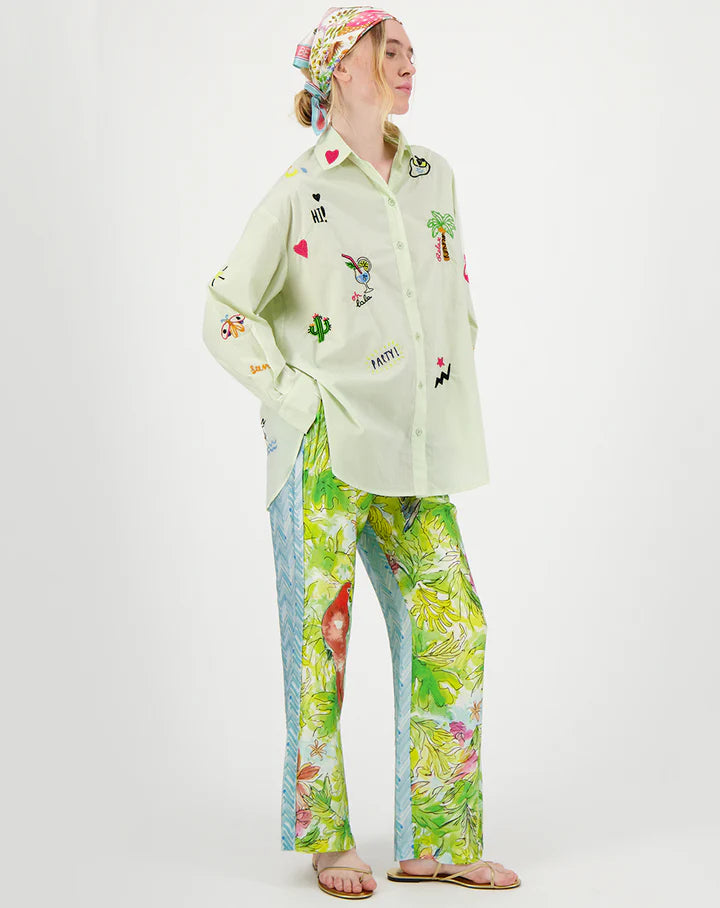 100% Viscose headkerchief. Stylized forest animals and trees in predominantly pinks and yellows. Border reads “IT’S A GOOD DAY TO BE HAPPY”. Artistic, eye catching accessory