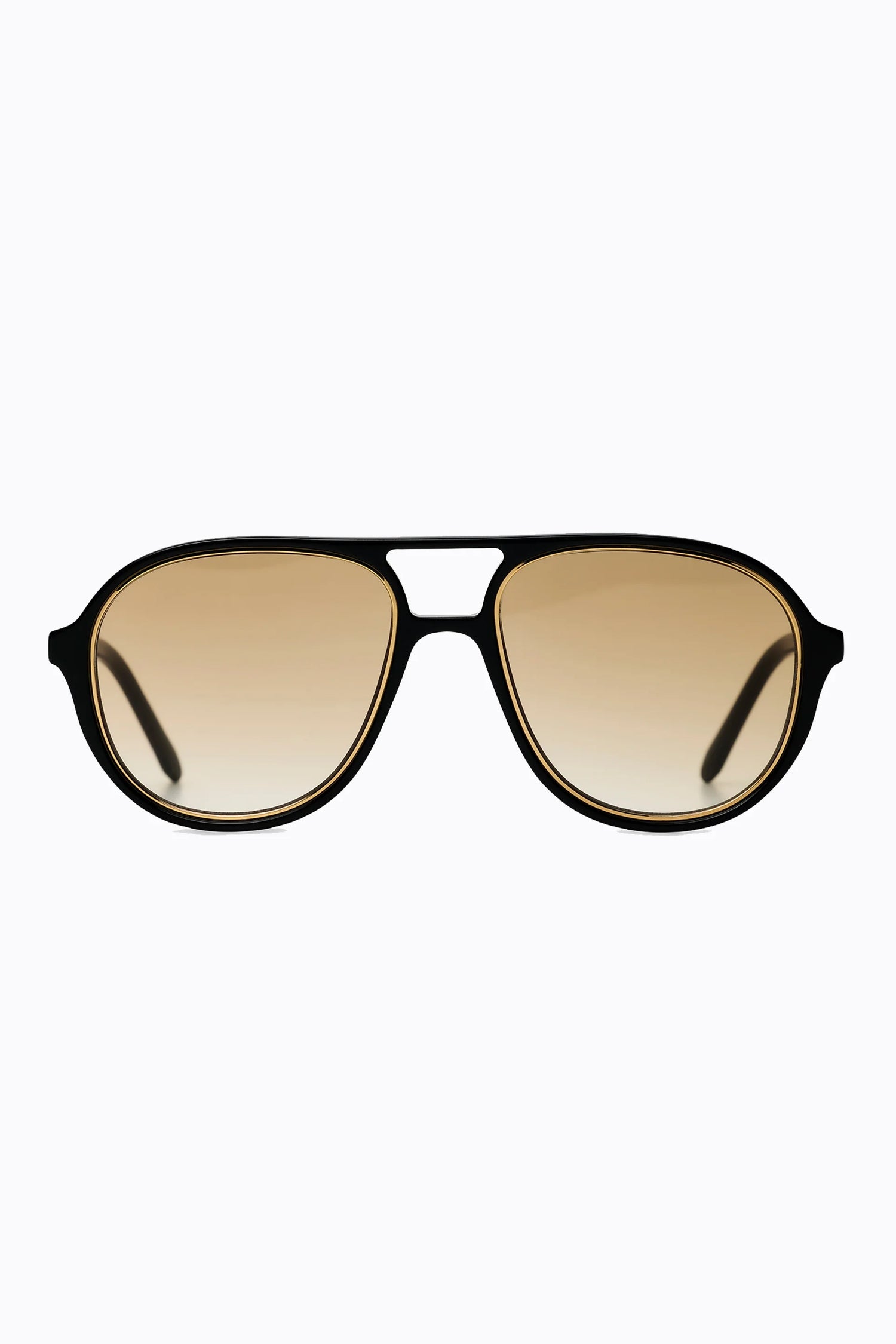 A lightweight take on our best-selling Jimbob aviators. Featuring an inner gold metal frame paired with a black acetate and brown/grey gradient CAT 1 UV-protected lenses