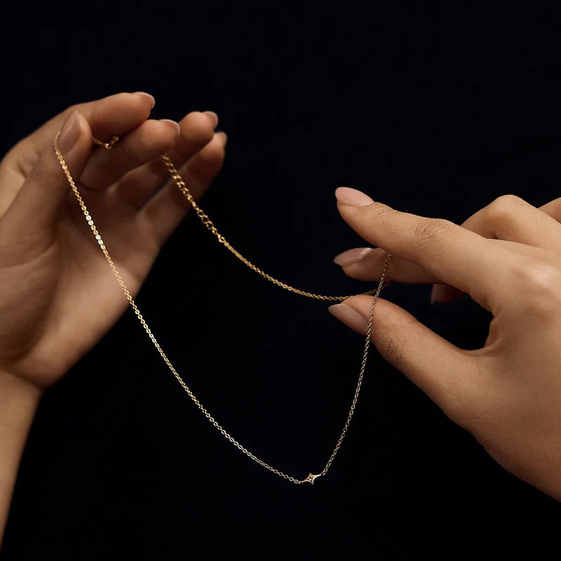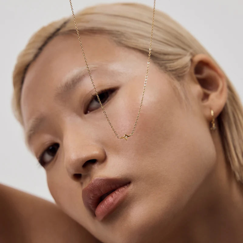 The Starburst Necklace features a dainty star shaped pendant embellished with a single twinkling white topaz stone, suspended from a fine chain.