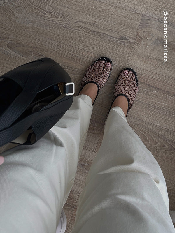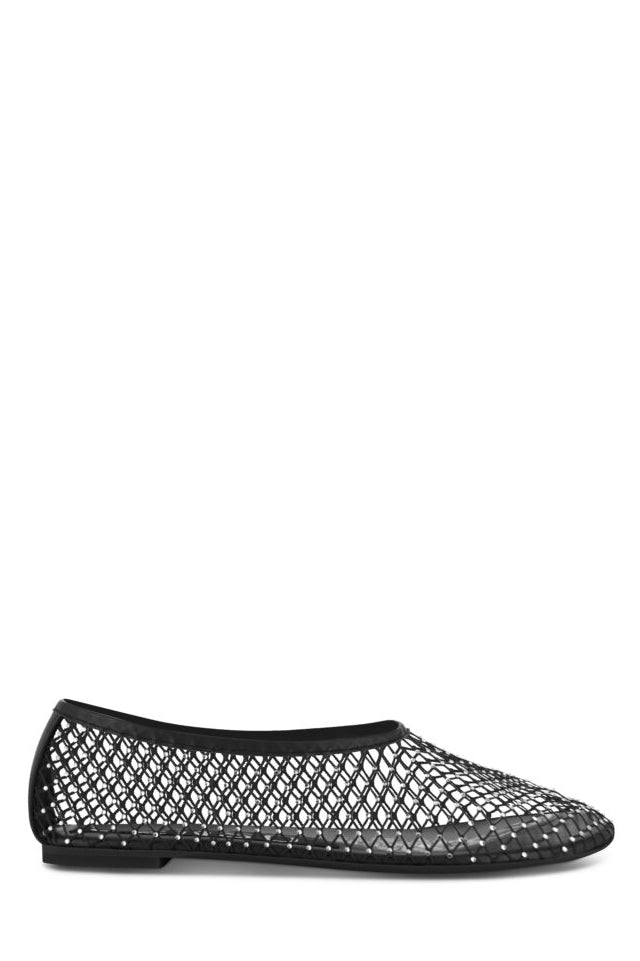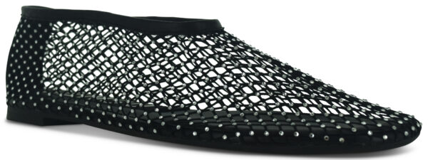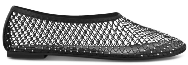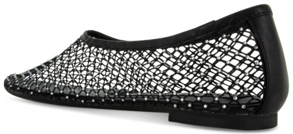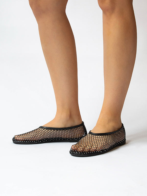 Black mesh crystal embellished ballet flat featuring a round toe and elasticated throat.