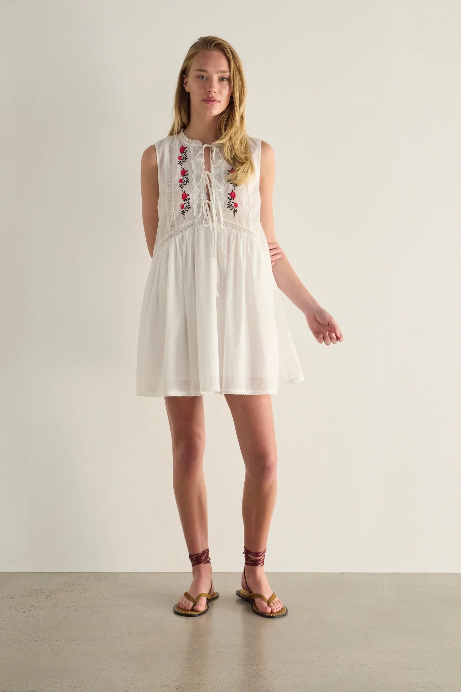 The Bellamy Mini Dress in white, with contrast hand-embroidered red roses, is your playful summer essential. Designed in a super-flattering babydoll silhouette, no detail has been spared—intricate embroidery, delicate pin tucks, lace touches, and functional ties—crafted from deliciously soft organic cotton. A sweet, artisanal piece made to brighten every warm day.