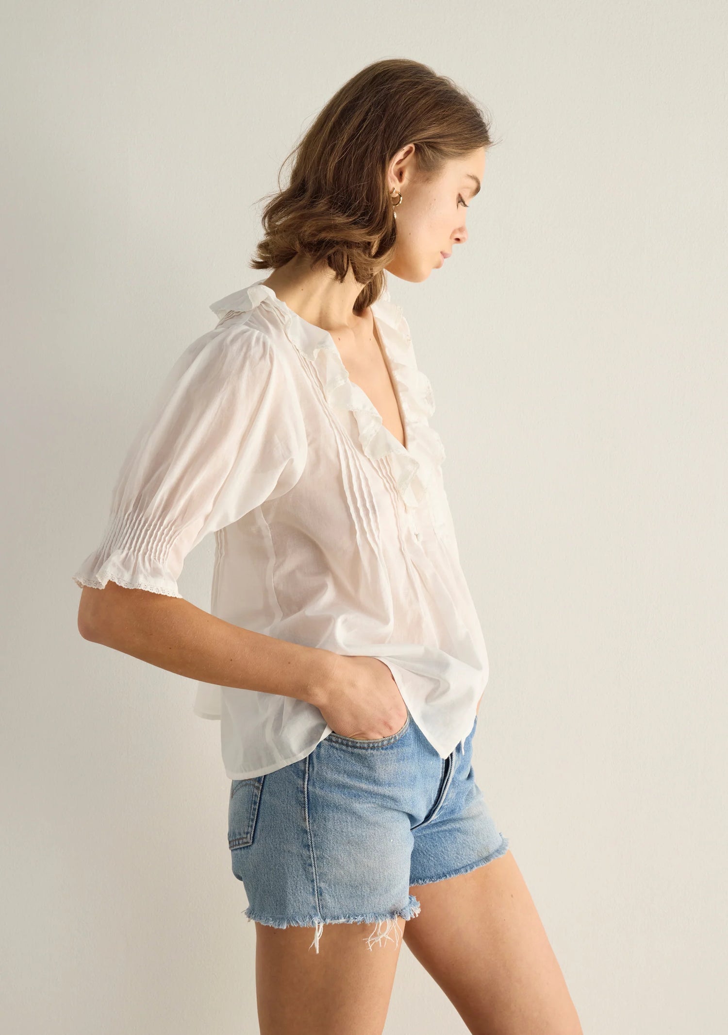 The vintage-inspired Rafael blouse showcases a V neckline and ruffle collar, short sleeves with pin tuck detailing, and feminine self-covered buttons. Crafted from 100% cotton, it blends timeless elegance with comfort.