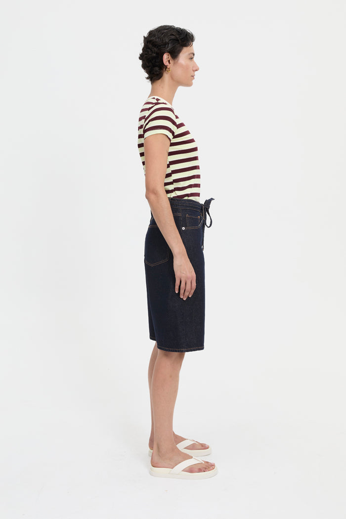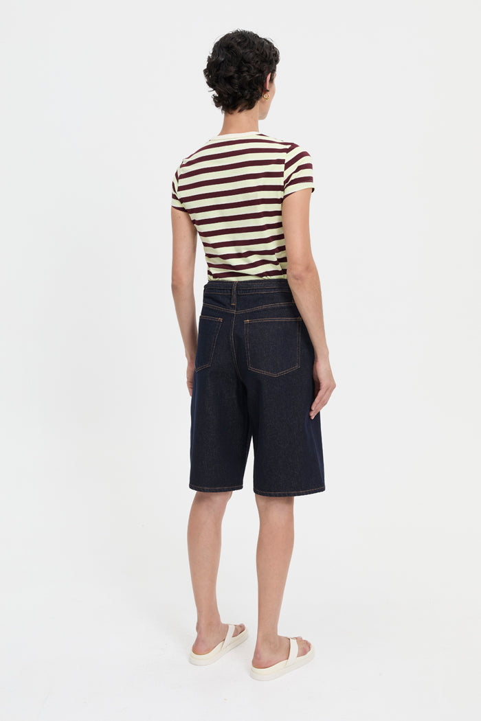 Cut from lightweight cotton in a burgundy and cream stripe, it offers a clean shape with soft structure.
