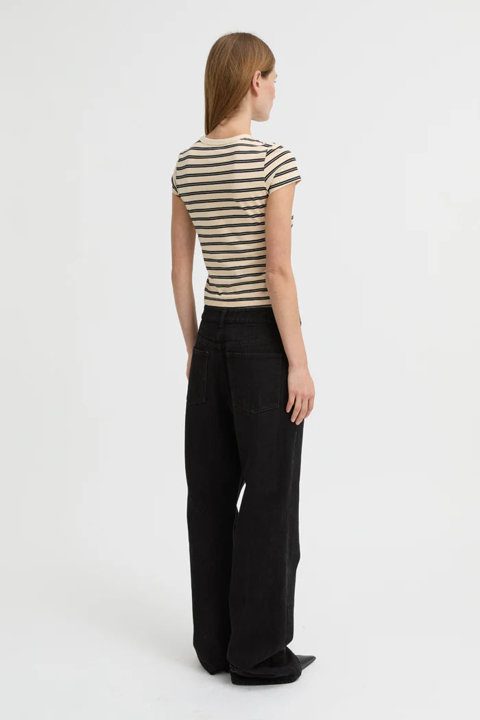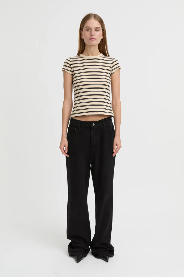 The Kendra Tee in Beige is a refined take on the classic baby tee, offering a sleek, form-fitting silhouette with elevated everyday appeal. Crafted in a soft beige cotton blend with contrast black stripes, it hugs the body with just the right amount of stretch. A minimalist crew neckline and short sleeves keep the shape clean and versatile, while tonal embroidery at the chest delivers a subtle branded finish. Designed to pair effortlessly with denim, tailored trousers or layered under oversized outerwear.