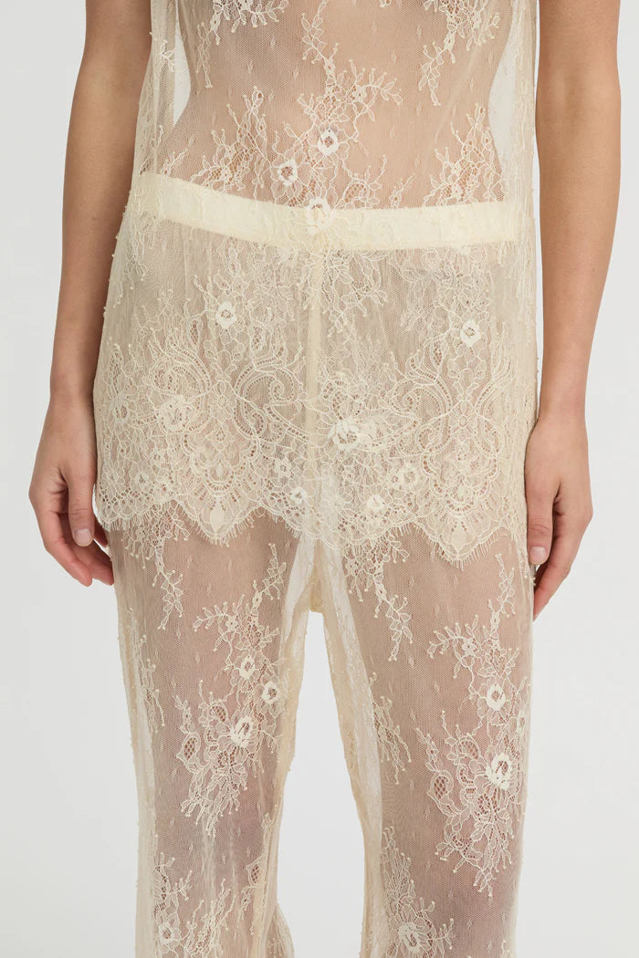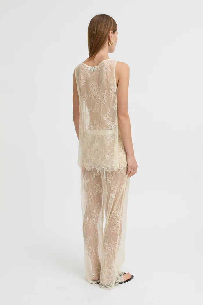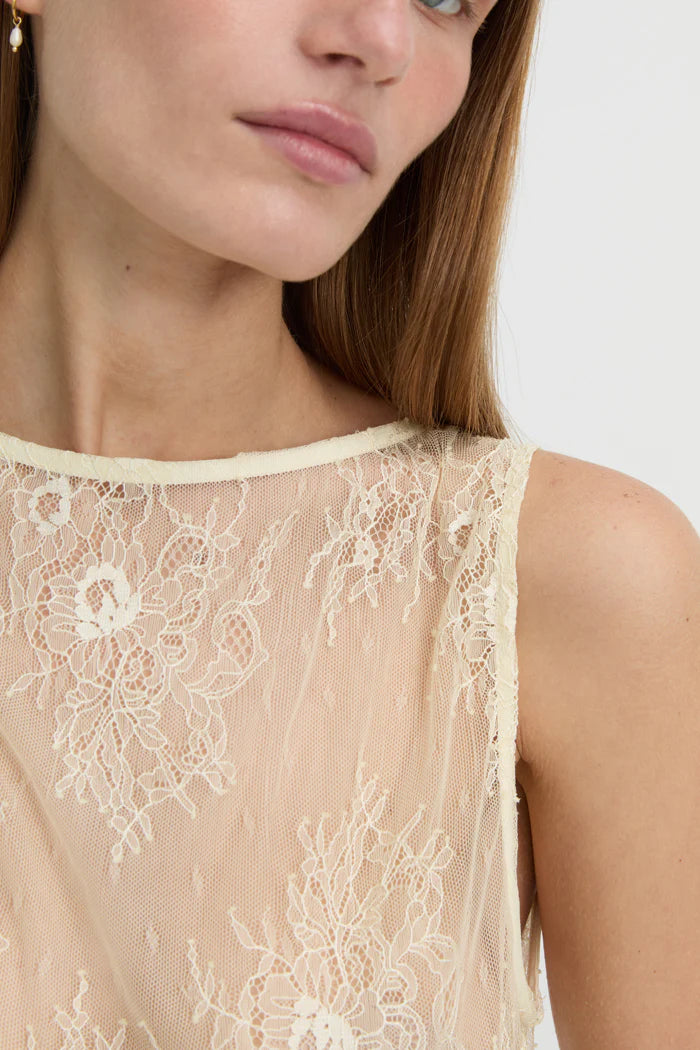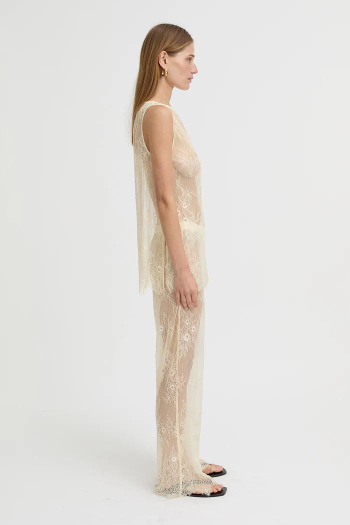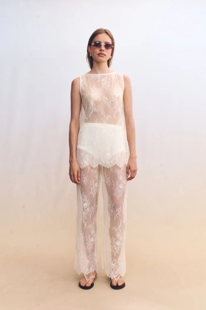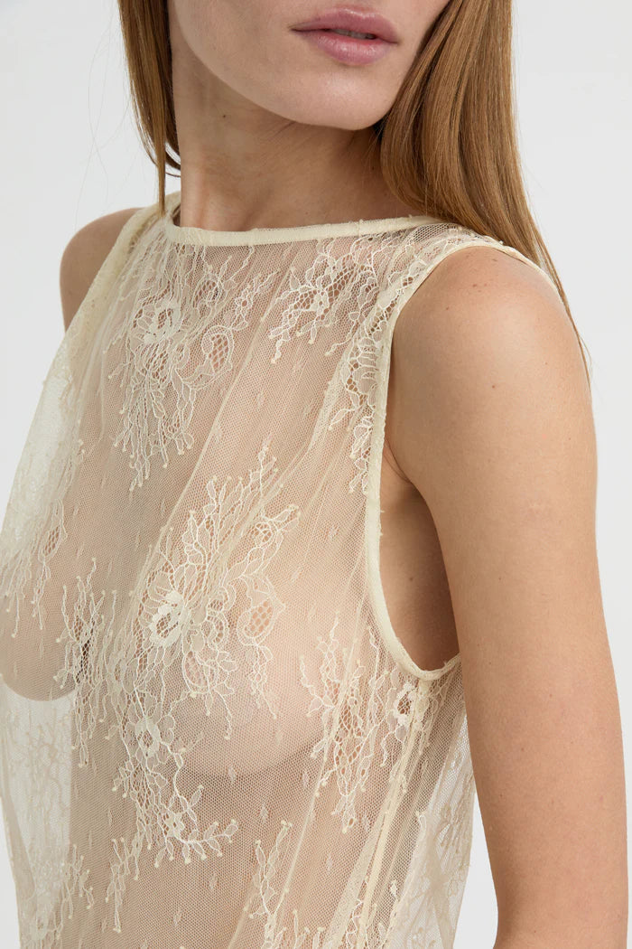 The Riven Tank balances delicacy with quiet intent. Crafted from sheer floral lace in a soft ivory hue, this sleeveless silhouette skims the body with ease. The high bateau neckline and longline fit offer understated structure, while the intricate embroidery brings depth and dimension to its transparency.
