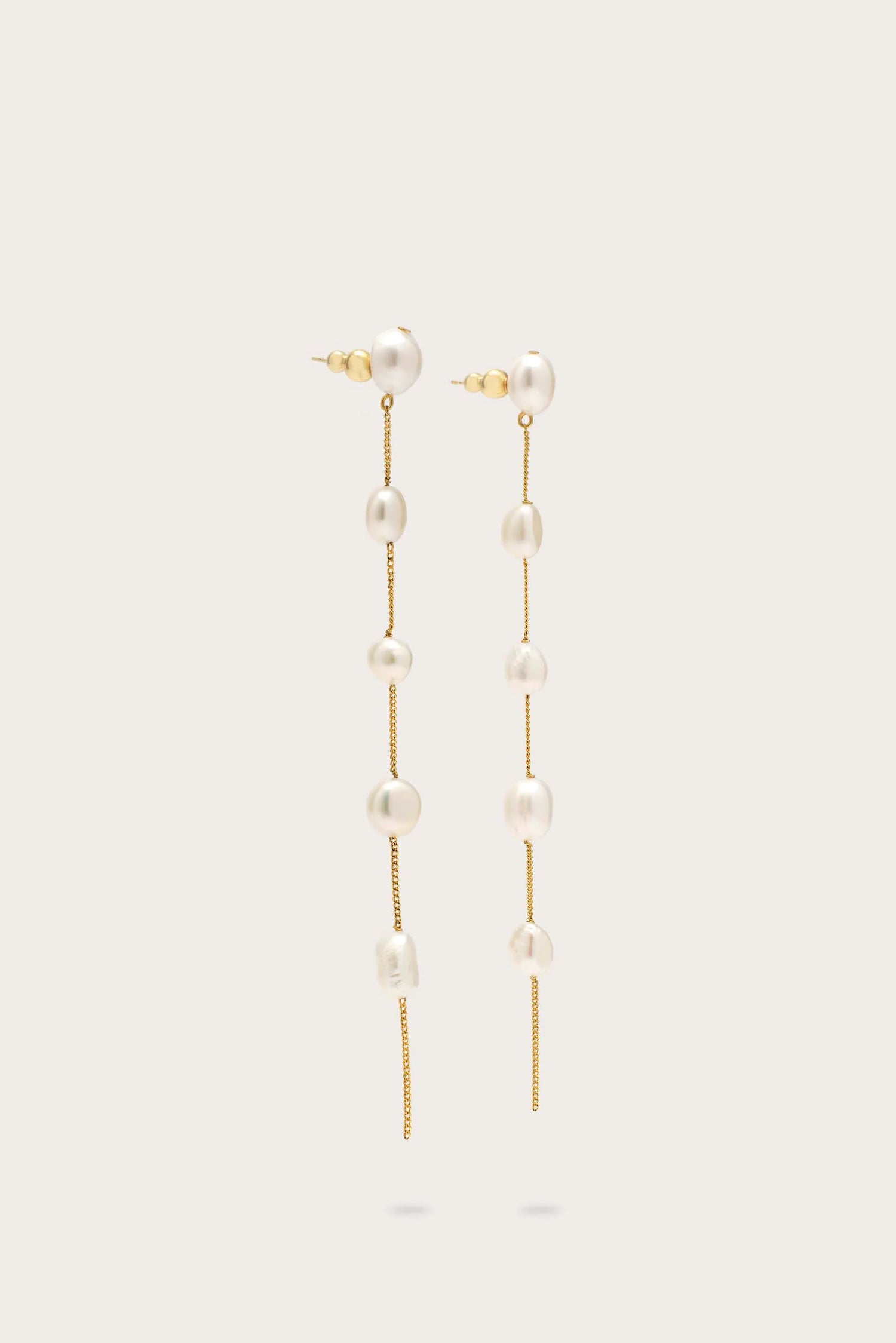 The Atum Earring has a stunning collarbone-grazing silhouette cast from brushed brass dotted with lustrous freshwater pearls. One of a kind, no two are alike.