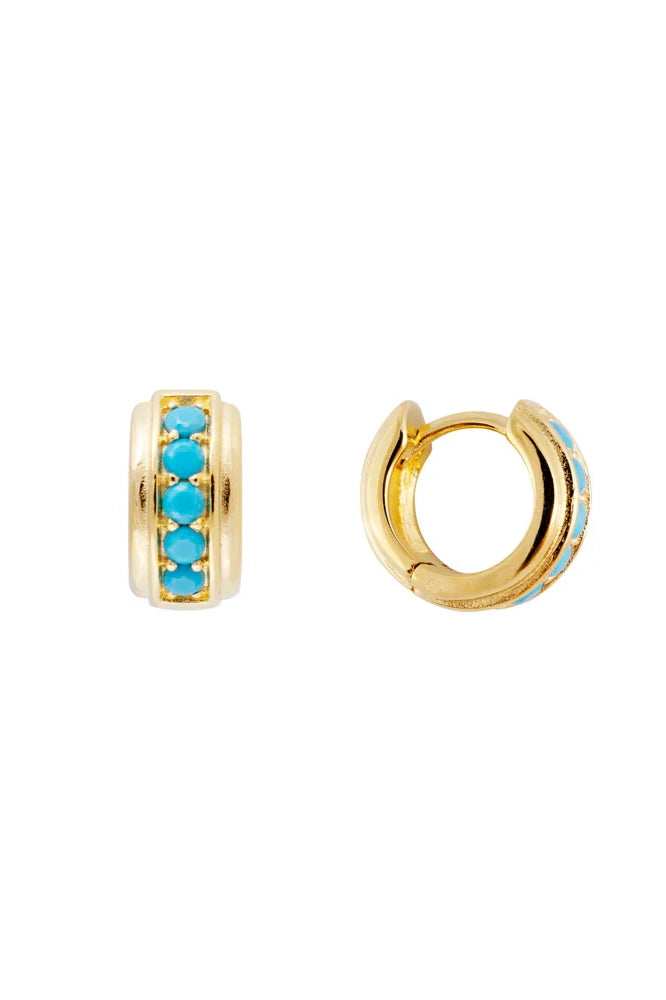 Dive into a splash of vibrant colour with the Blue Grotto Orb Huggies. These lightweight, elegantly crafted earrings feature a row of turquoise coloured crystals inspired by the depths of a hidden grotto. Perfect for adding a subtle yet eye-catching pop to any outfit, their secure huggie design ensures comfortable wear all day long.