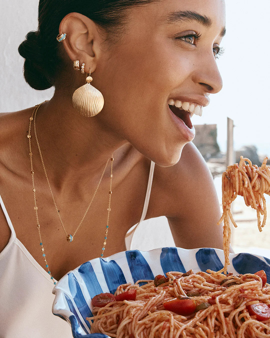 A striking fusion of elegance and coastal charm, the Blue Grotto Orb Necklace features a gold orb with turquoise crystals that evoke the tranquil depths of the sea. Suspended on a fine sterling silver 18k gold-plated rolo chain, the hand-finished pendant captures the light with every movement, offering a subtle shimmer that draws the eye.