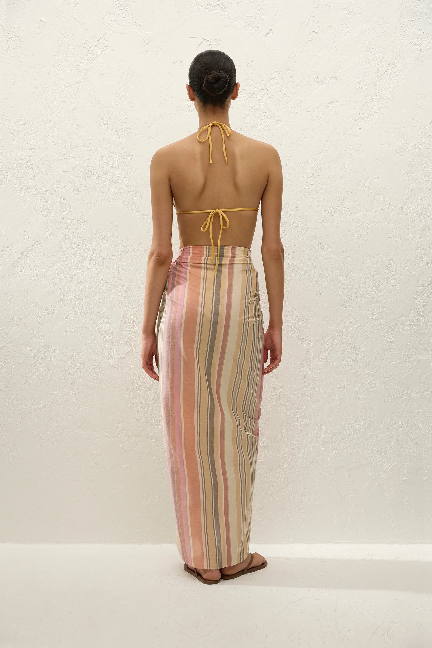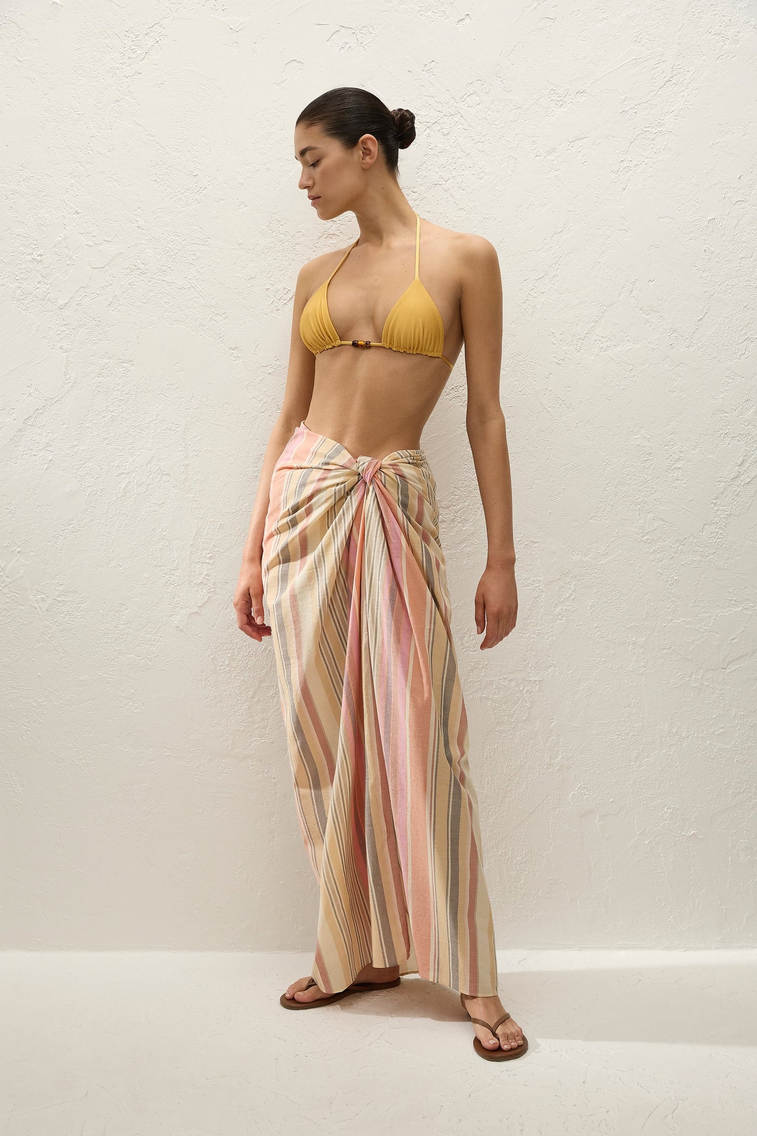 A summer essential, designed from a signature 100% cotton, yarn-dyed in soft yellows and pinks, reminiscent of the colours of an Italian sunset. Cut in one size, it can be styled as a maxi-pareo, folded in half as a mini-pareo or tied as a strapless top, carry bag or a beach towel.