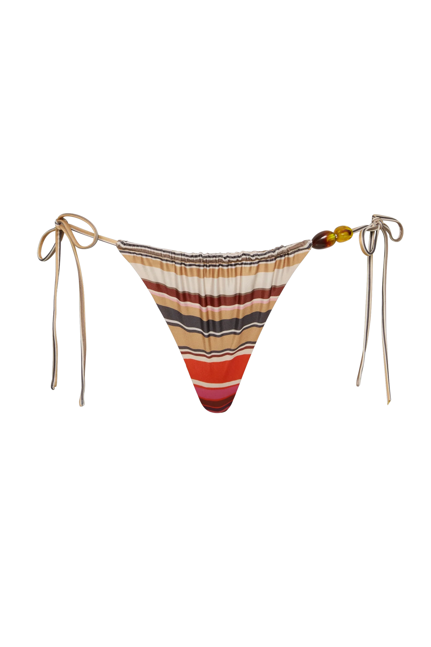 A retro-inspired triangle bikini bottom, designed from a 100% blend of recycled materials, including polyamide and elastane, in a vibrant multi-colour stripe, bringing in sunburnt tones of reds, pinks and yellows. Featuring adjustable side ties, as well as decorative resin beads, style with the matching Leone Bikini Top for an island escape.