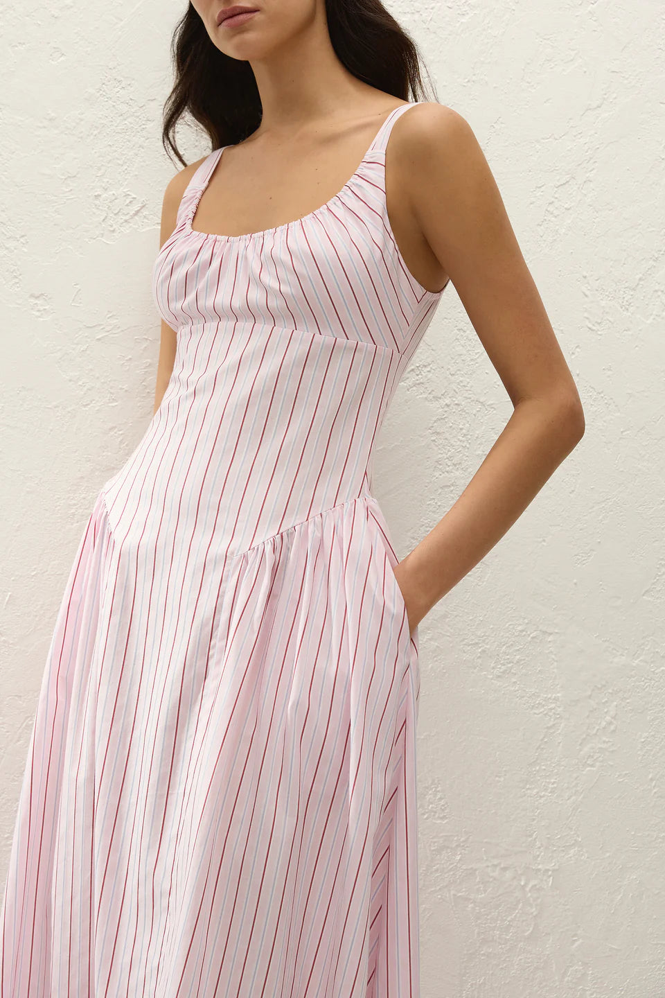 A vintage-inspired midi dress, designed from a signature 100% cotton, yarn-dyed in a nostalgic pink and red pinstripe. Fitted through the bodice with a scoop neckline and a gathered bust, it features a drop waist silhouette with further gathering at the sides. From there it falls into a soft A-line skirt, cropping above the ankles. With effortless throw-on throw-off appeal, style with the matching Lucia Head Scarf and a simple sandal for long summer days.
