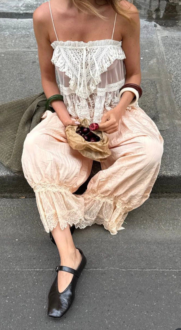 Features: Soft fabrication with a lightweight feel, smocked elasticated waistband with functional tie, gathered legs with tapered hem, sheer lace trim