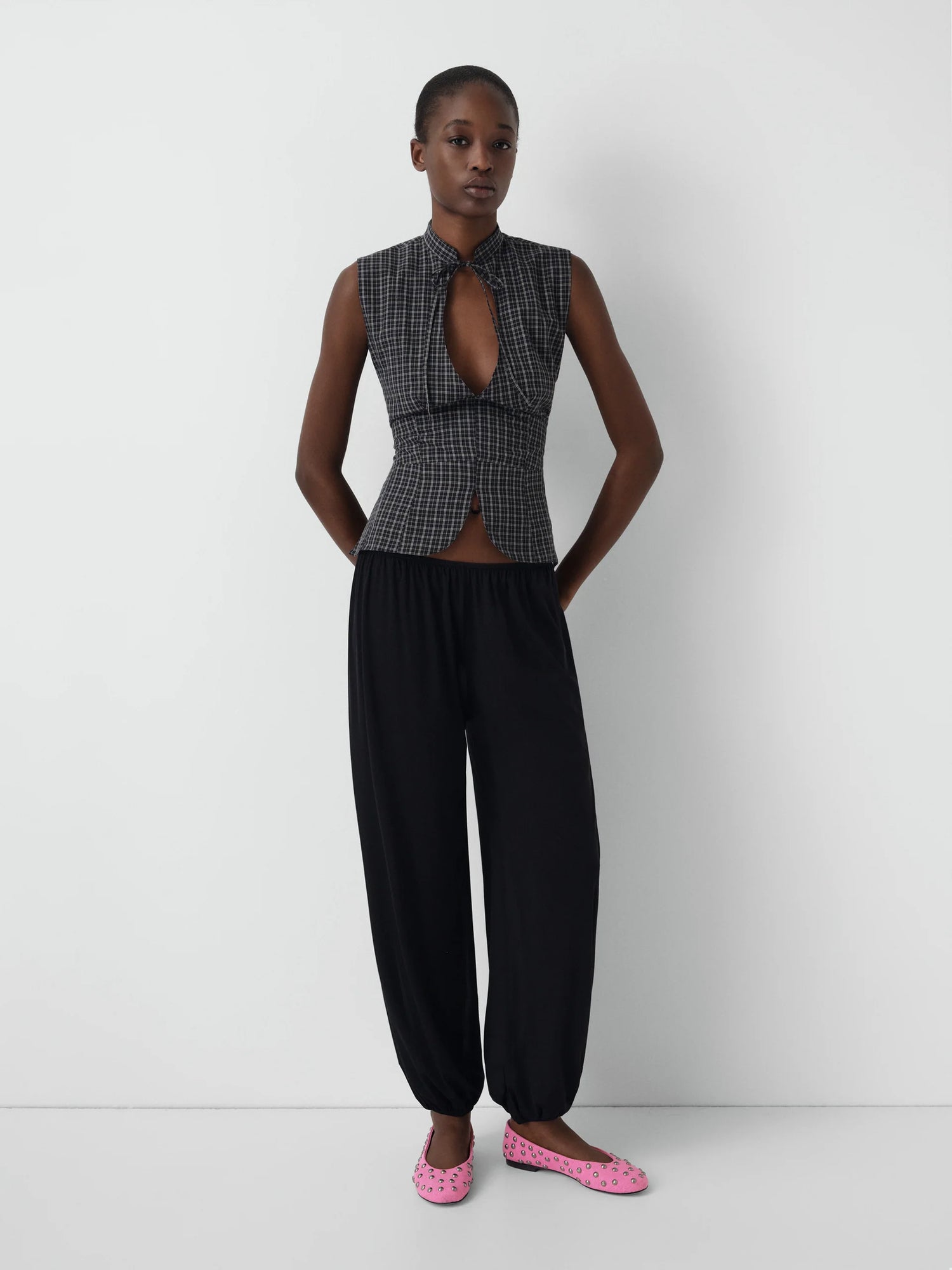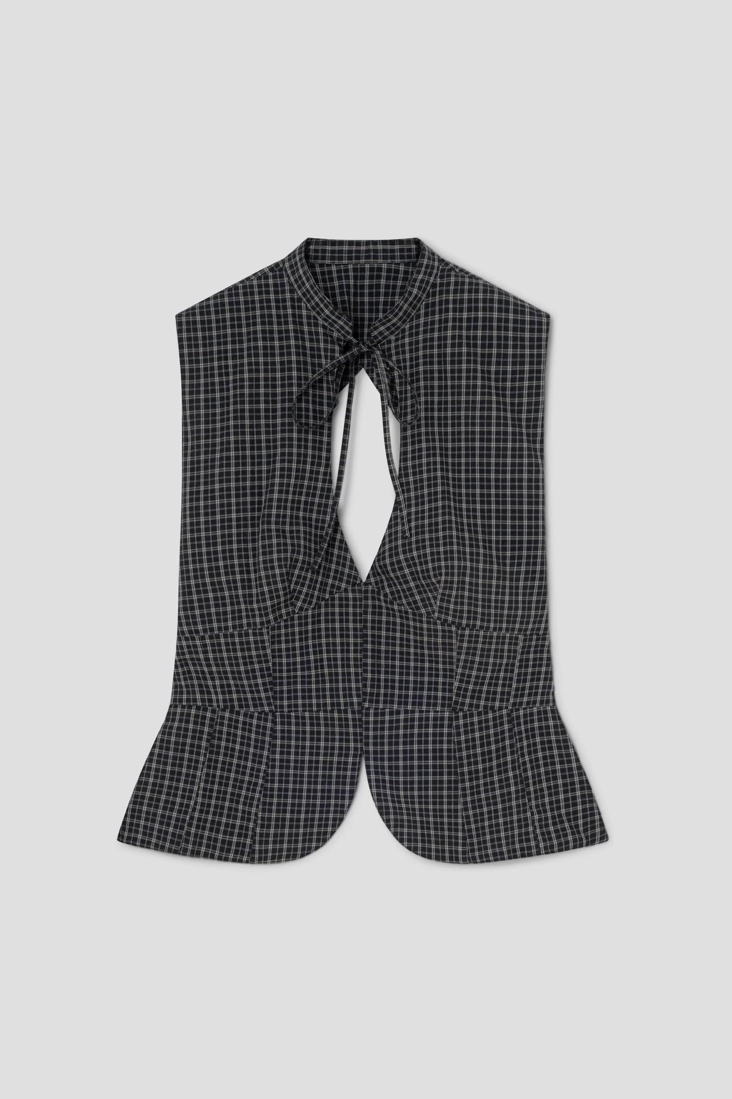Checkered top in black and grey with front cut-out and open back.