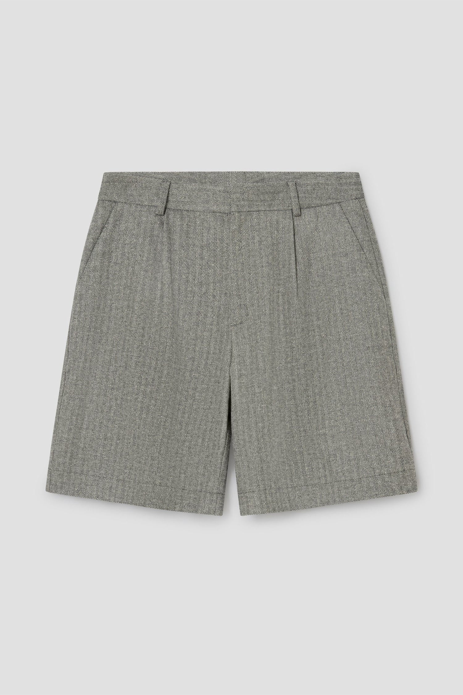 Grey and beige herringbone midi shorts with mid-rise fit and tailored cut.