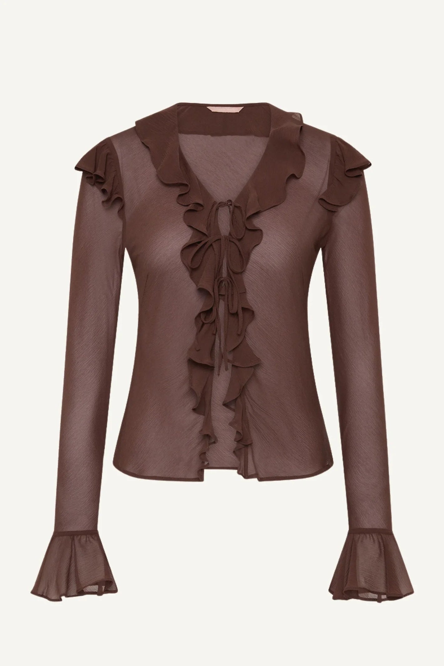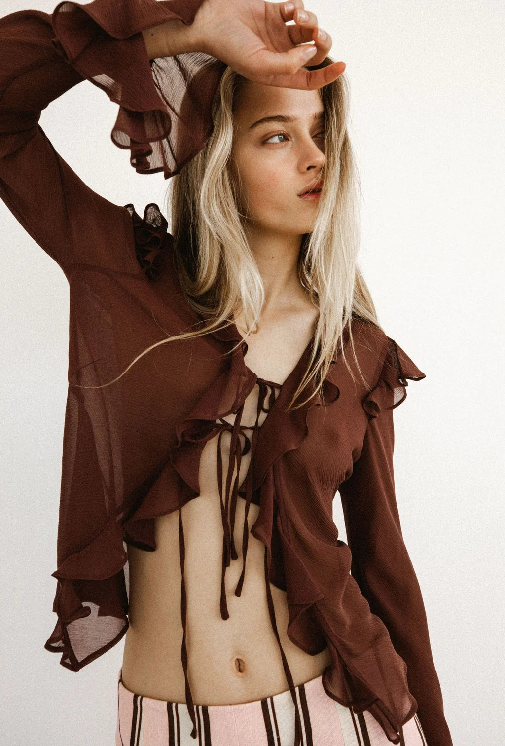 The original Cool About It Dress, reimagined in a top. With ruffle detailing down the torso and sleeves, and adjustable ties across the decolletege, style this sexy yet elegant silhouette as resort wear over a swimsuit or with your favourite MM denim. Model is 173cm and wearing a size S/8.