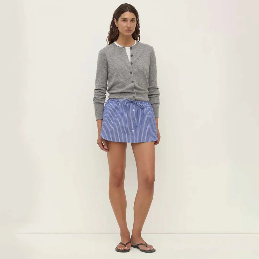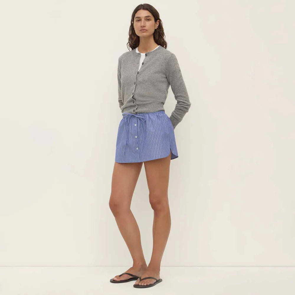 The Anais Stripe Skirt in blue/white stripe is a 100% cotton mini skirt with a drawstring waistband, front button detail and curved hem shape.
