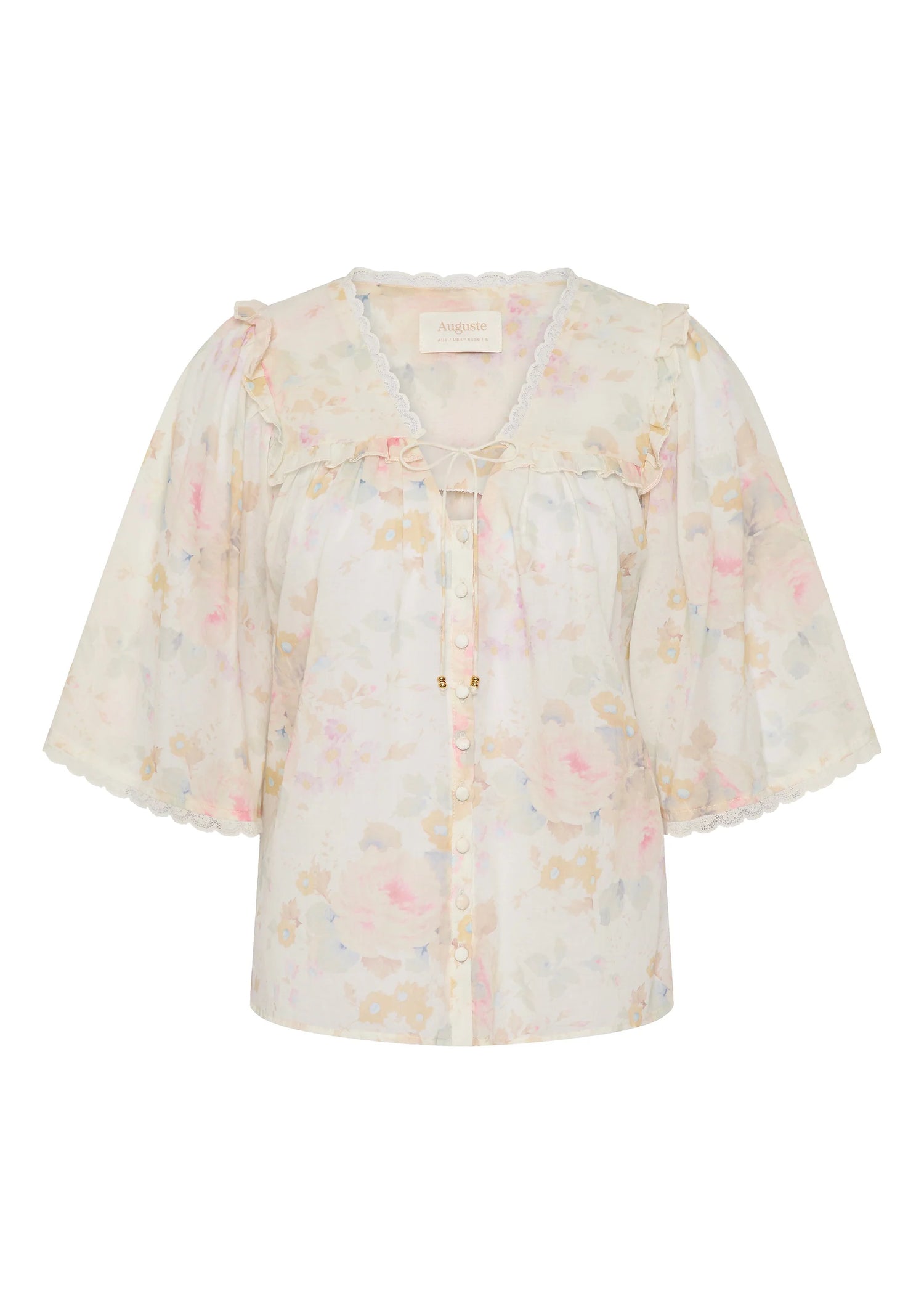 Soft and feminine, the Maven Blouse in our Opaline print is a romantic summer staple with delicate frill accents, voluminous flutter sleeves trimmed with lace, and an optional tie neckline, finished with a floaty silhouette — it’s your denim’s new best friend.