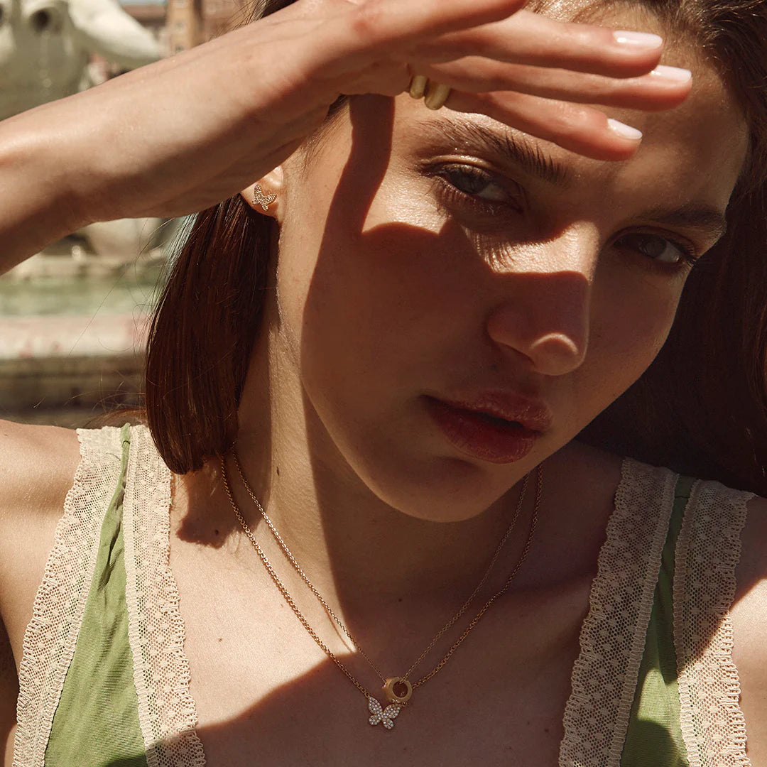 Delicate yet full of charm, the Butterfly Pave Studs bring a whimsical touch to any look. Crafted from high-quality sterling silver and adorned with shimmering crystals, these studs catch the light with every turn. Their petite butterfly design adds a playful elegance, perfect for both everyday wear and special occasions.