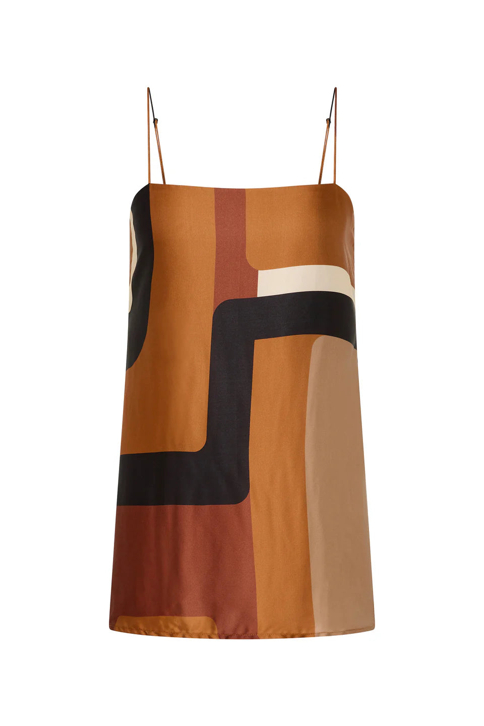 A 90s-inspired slip-style top, designed from a luxurious viscose satin fabrication, in a unique geometric print. Hanging effortlessly off the body in a straight silhouette, it features a straight neckline and thin adjustable straps as well as side seam splits. The hem is finished with a navy blue band. Style over the matching Jensen Pant for an elevated approach to everyday dressing.