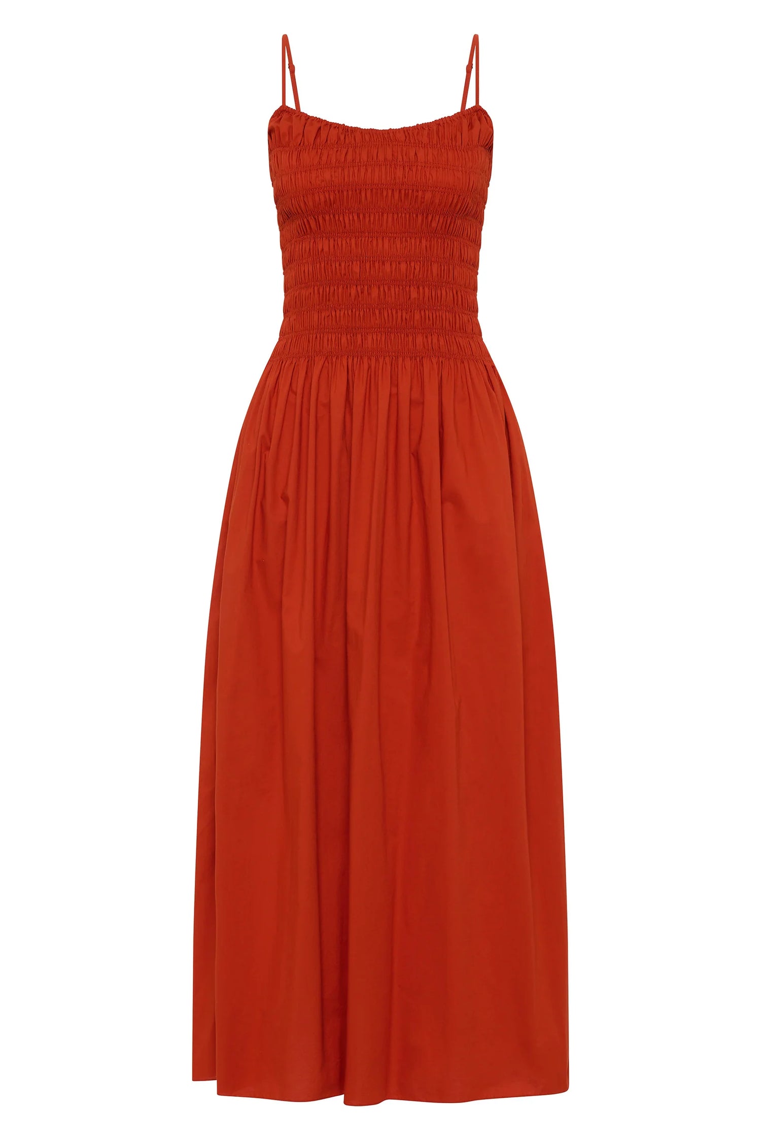 A seasonal maxi dress, designed from a signature 100% BCI Certified organic cotton in a dusty tomato red. Shirred through the bodice with thin straps, adjustable in length, it features a gathered waist with relaxed side seam pockets before falling into a soft A-line skirt. With effortless throw-on throw-off appeal, style with a simple sandal for day to night dressing.