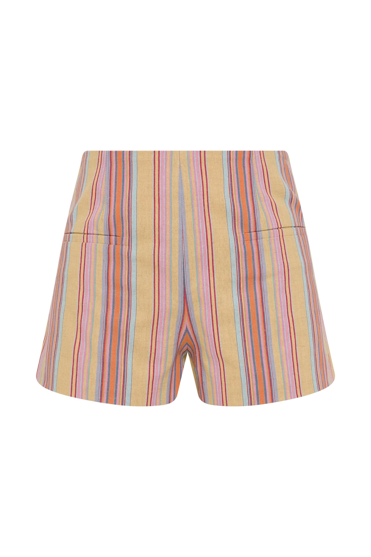 A mid-rise mini short, designed from a unique cotton linen blend in a warm mustard and mauve stripe, inspired by the colours of Mexico City. Fitting comfortably at the hips, they are a straight silhouette that crops short on the body. Style with the matching Aurora Top for summer set dressing.