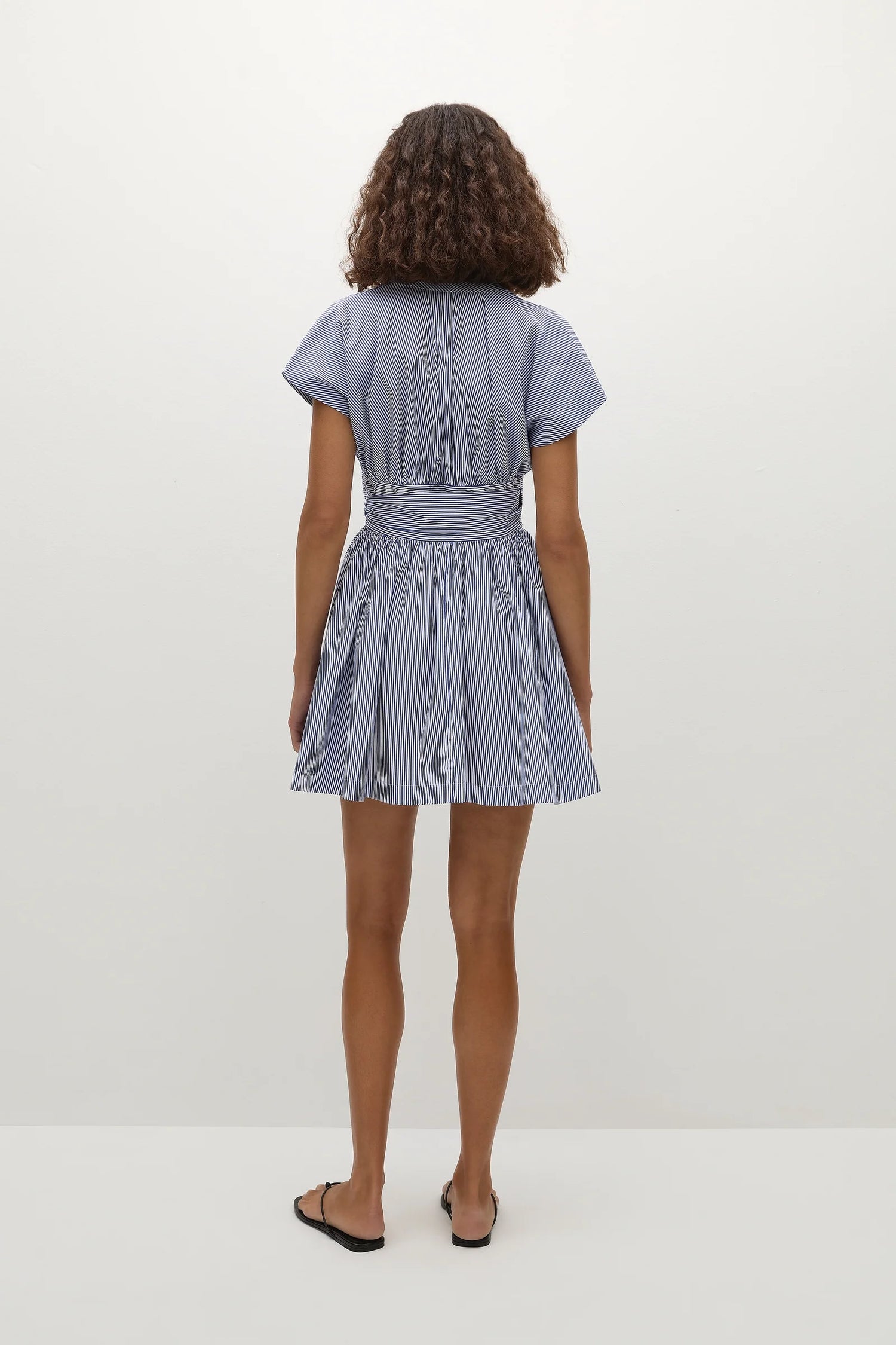 A vacation-inspired mini dress with a deep V-neckline and short cap sleeves. A functional wrap-style silhouette, it features a fixed waistband with an adjustable tie, before relaxing into a gathered A-line skirt, cropping short on the body. Designed from 100% BCI Certified organic cotton in a classic Scandinavian-inspired blue white stripe, style with a simple sandal for late summer dressing.