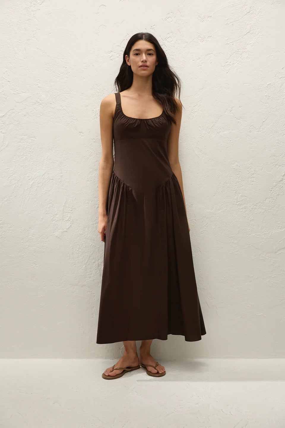 A transeasonal midi dress, designed from a signature 100% cotton in a deep espresso brown. Fitted through the bodice with a scoop neckline and a gathered bust, it features a drop waist silhouette with further gathering at the sides. From there it falls into a soft A-line skirt, cropping above the ankles. With effortless throw-on throw-off appeal, style with a simple sandal for everyday and vacation wear.