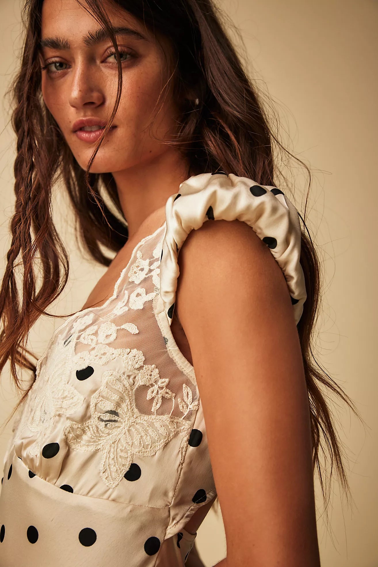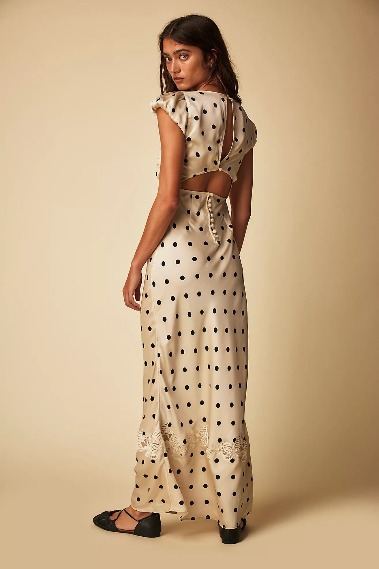 Perfect in polka dot, this stunning maxi dress is featured in a classic, A-line silhouette with butterfly lace-adorned neckline and slightly puffed capped sleeves for an added timeless touch.