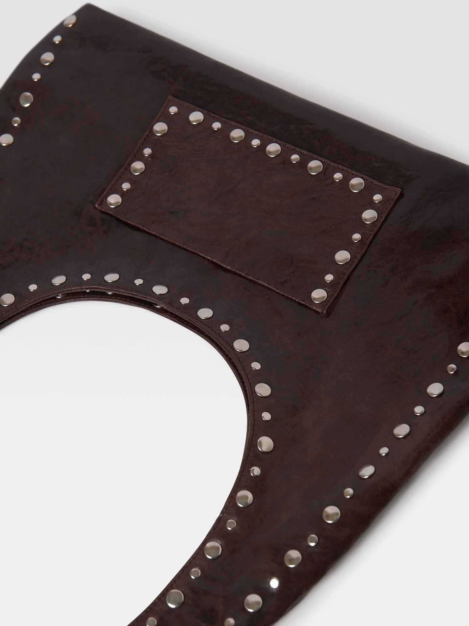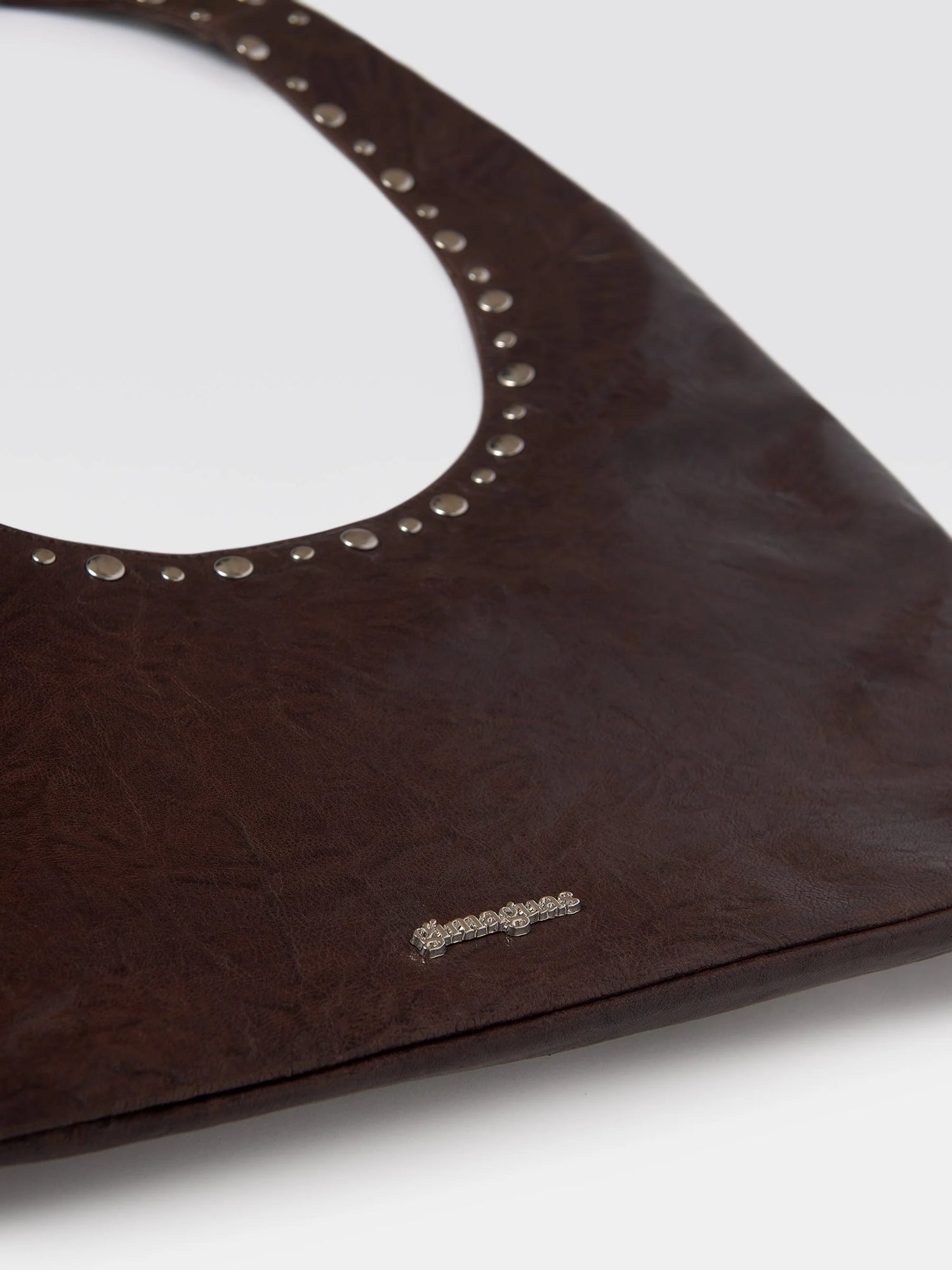 Brown lamb leather women's shoulder bag with a flat handle. Accented with metal studs along the edges. Includes one interior and one exterior pocket, cotton lining, and a discreet magnetic closure. Finished with a metallic Gimaguas logo on the back.