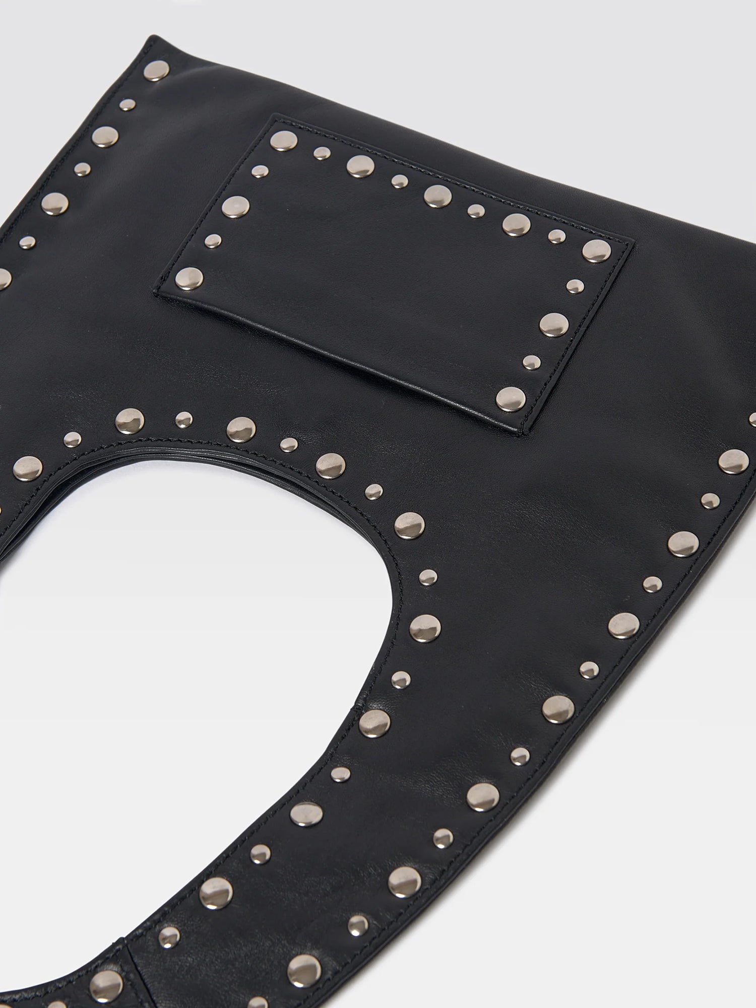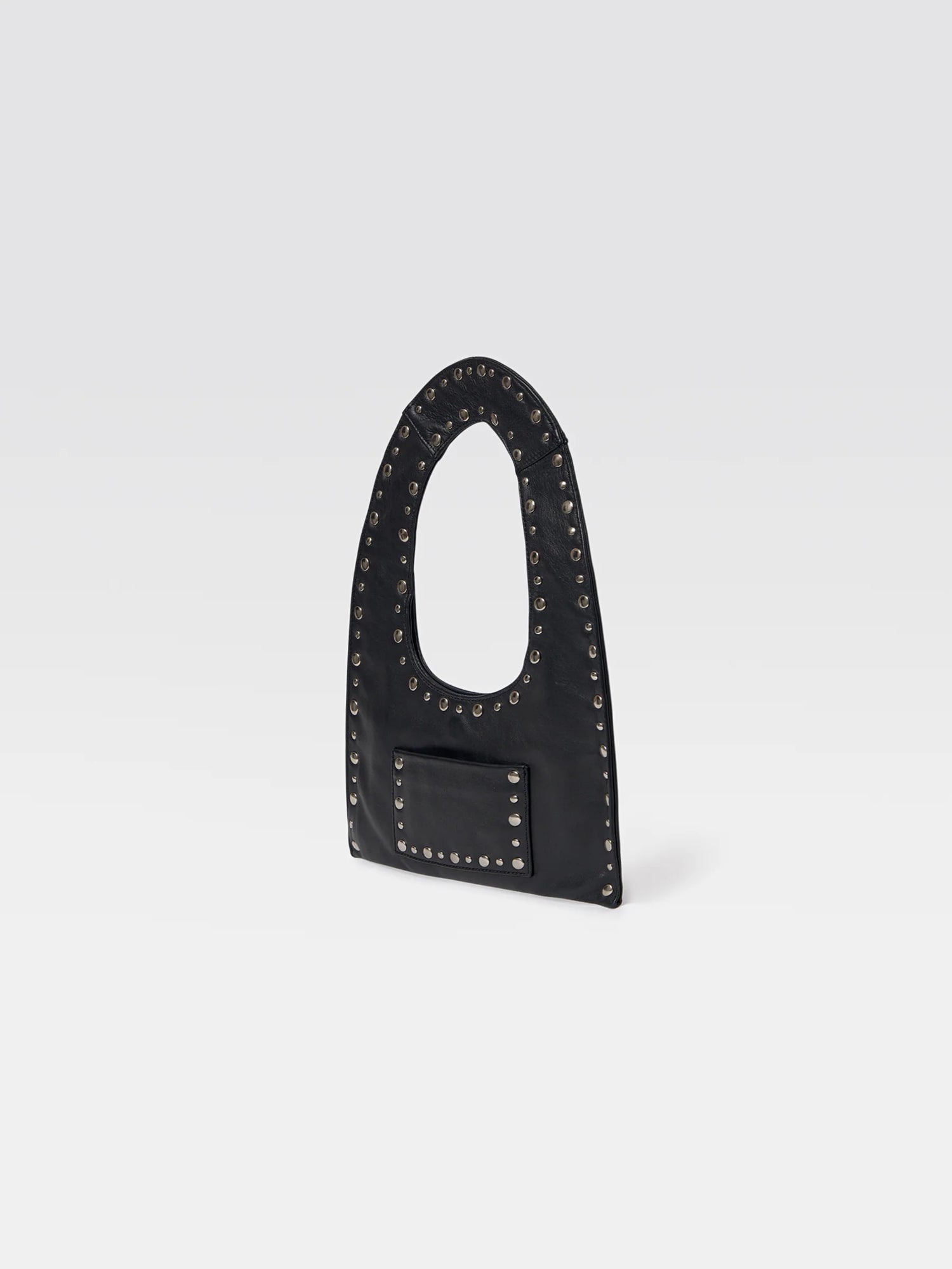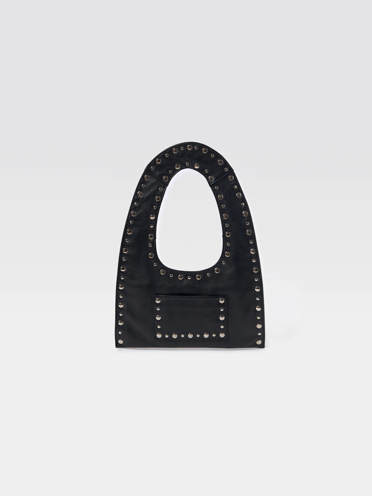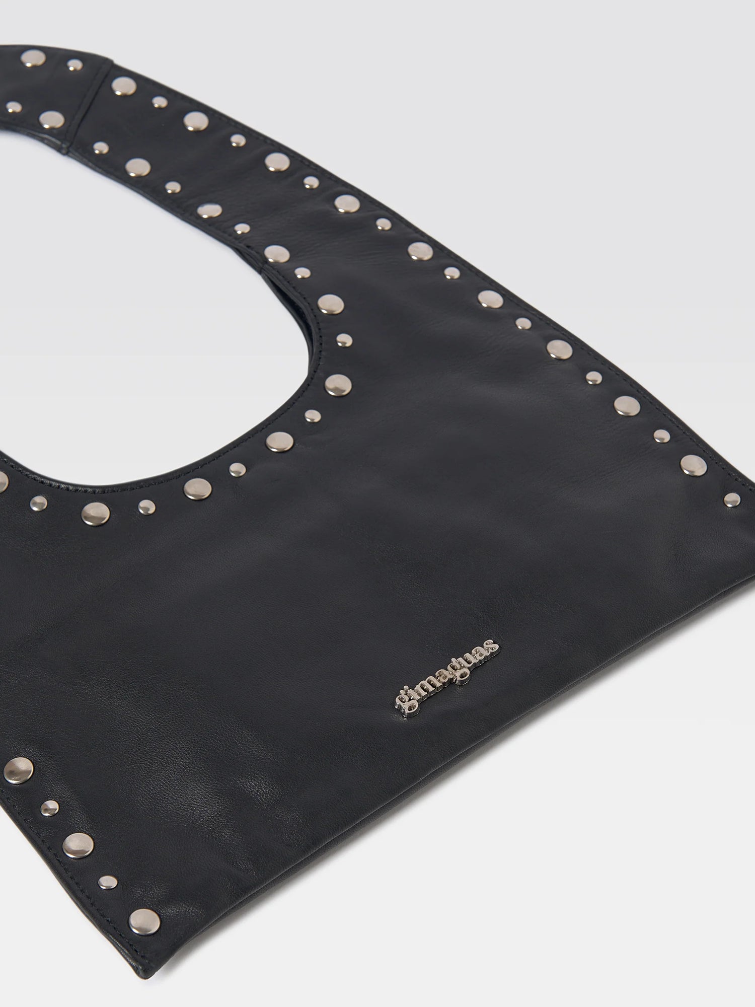 Mini black lamb leather women's handbag with a flat handle. Accented with metal studs along the edges. Features one interior and one exterior pocket, cotton lining, and a discreet magnetic closure. Finished with a metallic Gimaguas logo on the back.