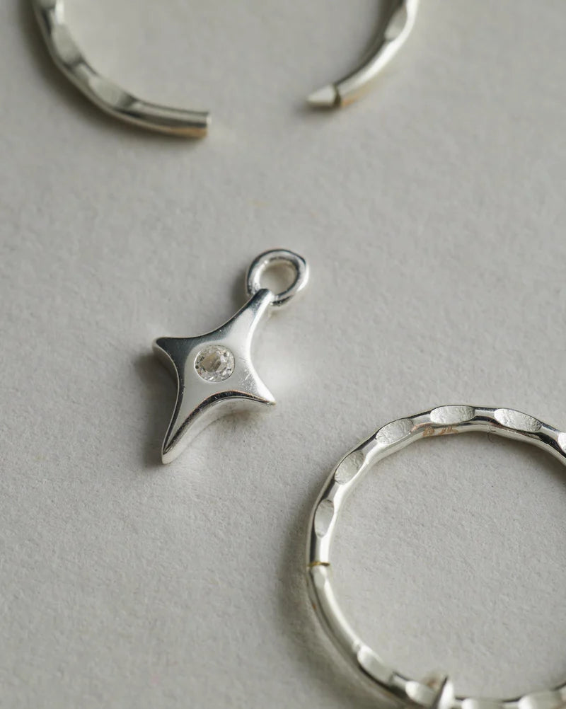The Starburst Mini Hoops feature faceted sleepers adorned with dainty star shaped charms embellished with a single twinkling white topaz stone.
