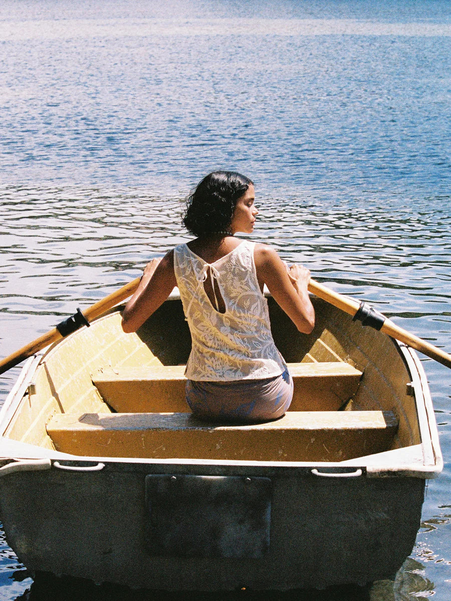 Trellis translates our Florienne artwork into another iteration of our custom embroidered lace — a lattice of interwoven cotton that carries the floral design through structure rather than print. Like its architectural namesake, the fabric plays on transparency with its sheer, unlined construction.