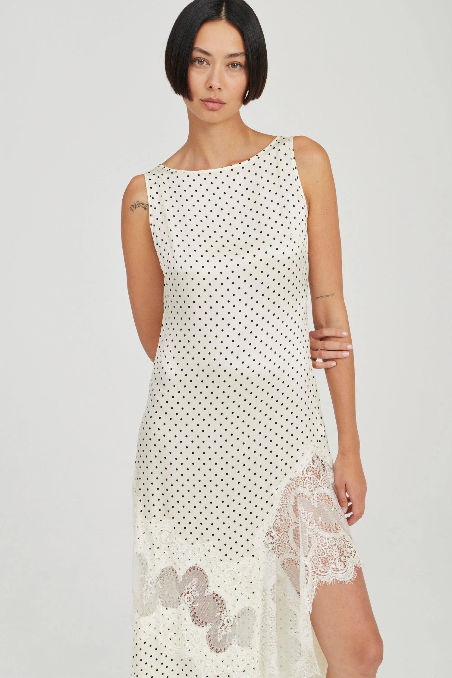 Crafted from sandwashed cupro, the Visions Lace Frill Dress is designed with fluidity and movement in mind. The clean, sleeveless bodice falls into an asymmetric hemline, framed by delicate lace paneling that adds depth and dimension. A thigh-high split enhances the drape, creating an effortless interplay between structure and softness.