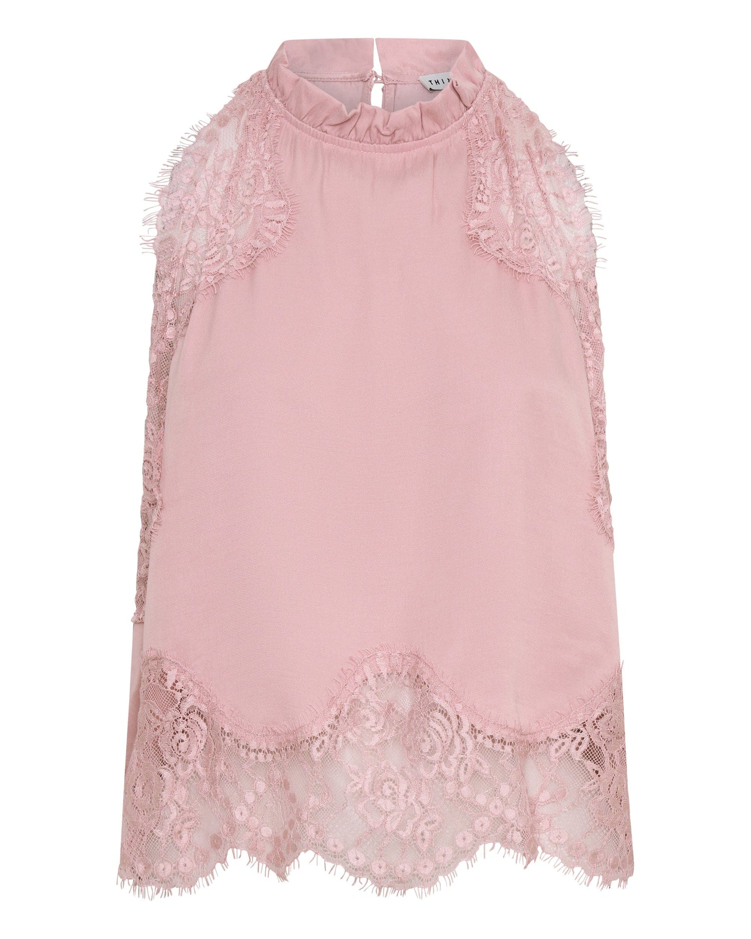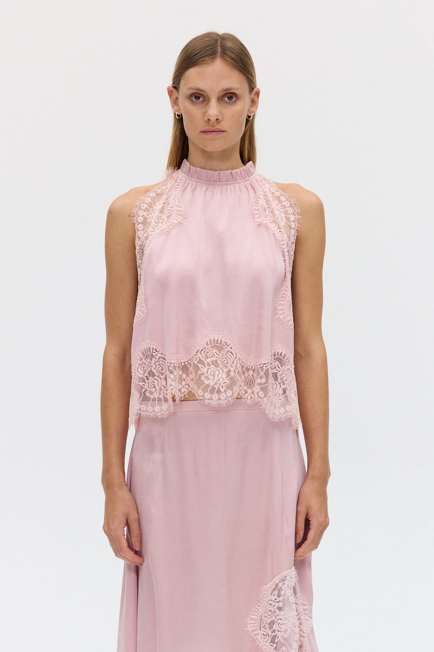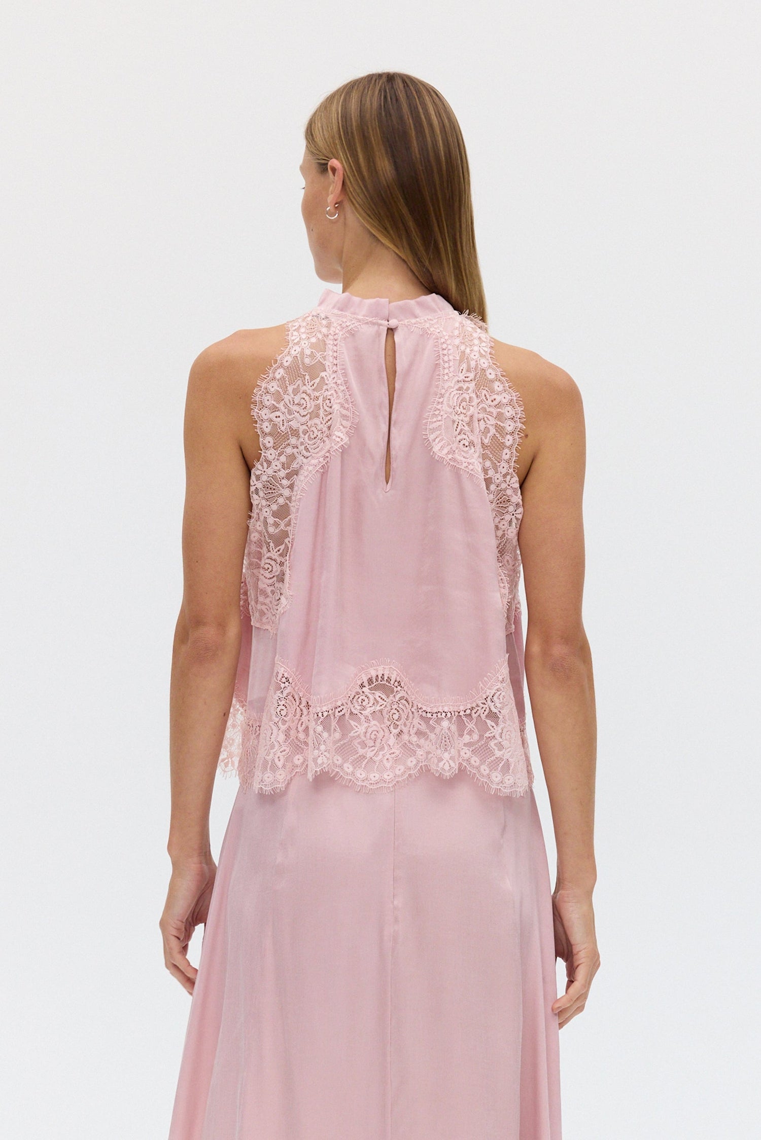 Crafted in sandwashed Cupro, the Visions Lace Top in blends delicate craftsmanship with modern elegance. A high neckline and softly gathered bodice create a fluid drape, while intricate lace paneling traces the shoulders and hem, adding a touch of romance. Designed for versatile styling, this sleeveless silhouette flows effortlessly, making it the perfect pairing for both tailored and relaxed separates.