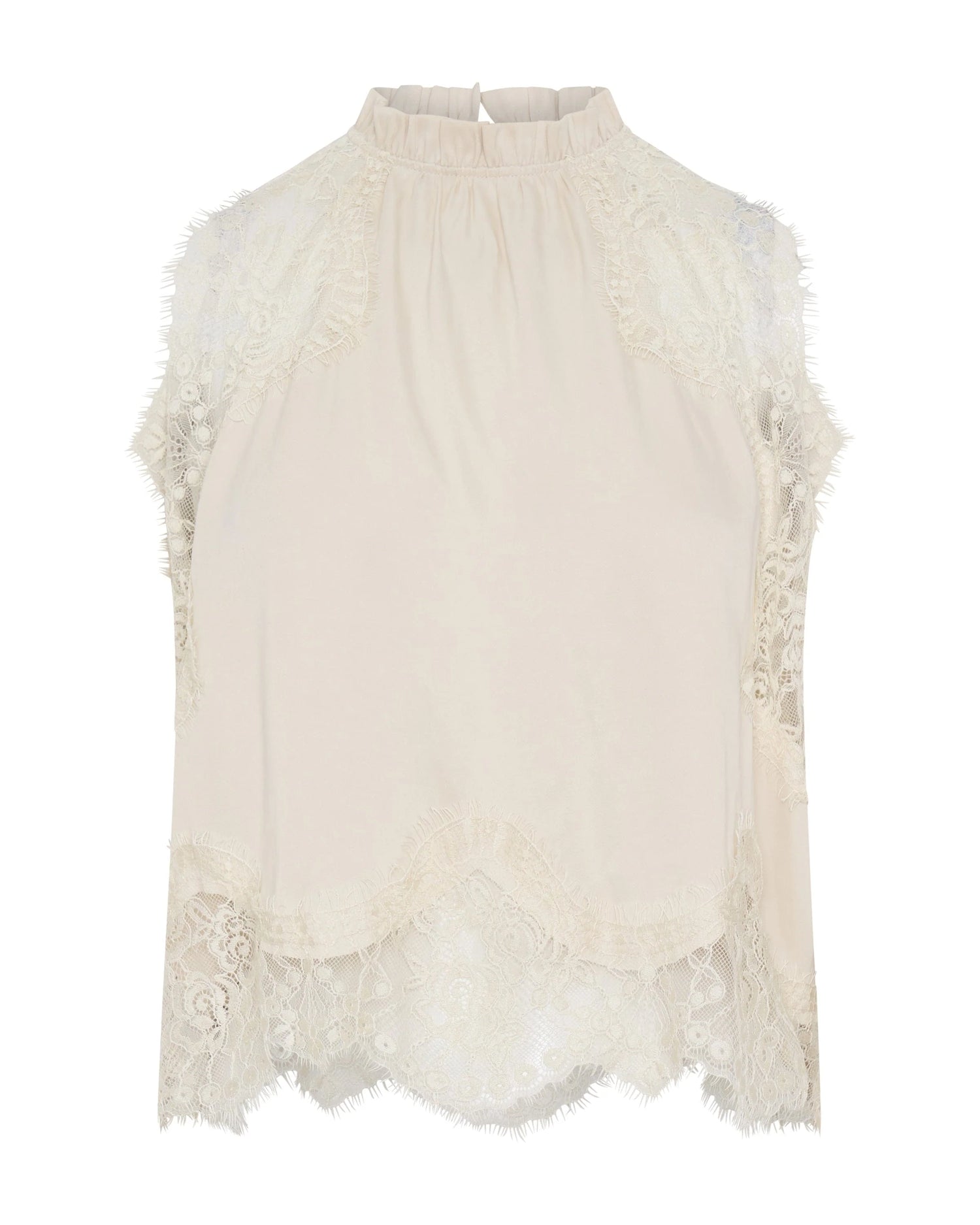 Crafted in sandwashed Cupro, the Visions Lace Top in blends delicate craftsmanship with modern elegance. A high neckline and softly gathered bodice create a fluid drape, while intricate lace paneling traces the shoulders and hem, adding a touch of romance. Designed for versatile styling, this sleeveless silhouette flows effortlessly, making it the perfect pairing for both tailored and relaxed separates.